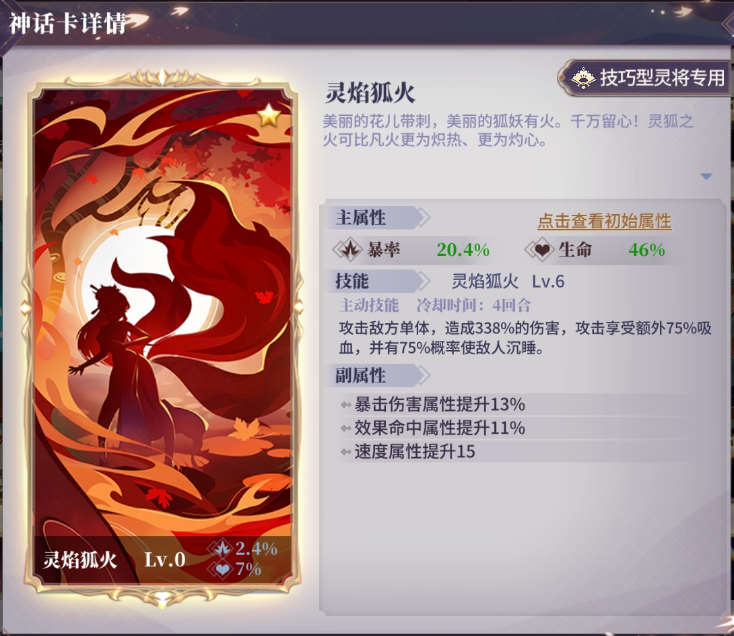 灵焰狐火:单体控制类神话卡,主属性缺乏速度,虽然有较高的伤害,但是相比其他技巧型神话卡的各种特色技能,相差甚远。