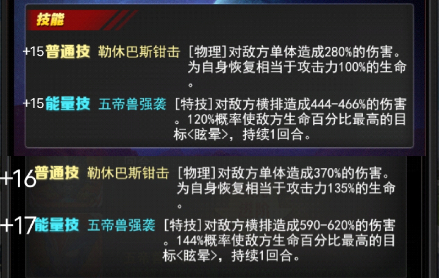 +15能量技 五帝兽强袭[特技]对敌方横排造成444-466%的伤害120%概率使敌方生命百分比最高的目
