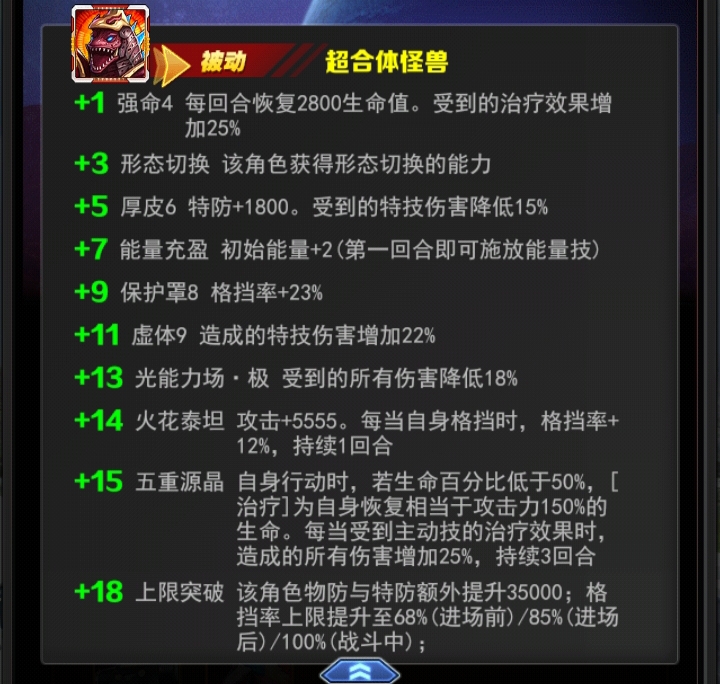 +15五重源晶 自身行动时,若生命百分比低于50%,[治疗]为自身恢复相当于攻击力150%的