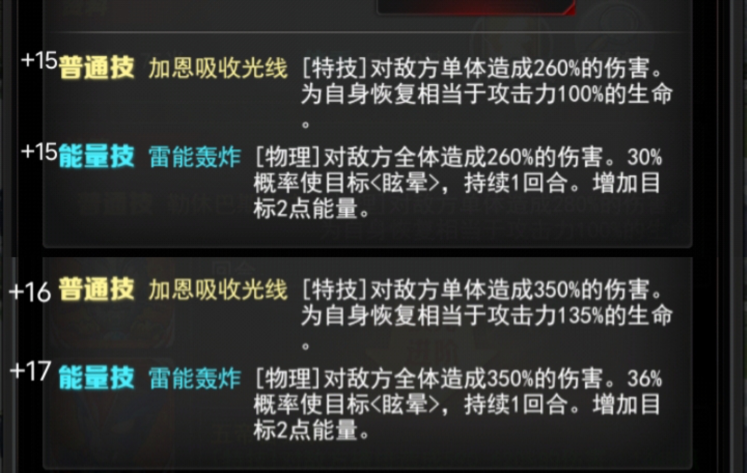 +17能量技 雷能轰炸 [物理]对敌方全体造成350%的伤害。36%概率使目标<眩晕>,持续1回合。增加目
