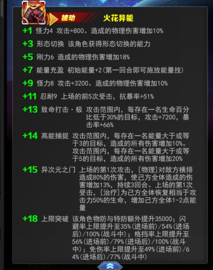 +15 异次元之门 上场的第1次攻击,[物理]对敌方横排造成80%的伤害,使己方全体造成的伤