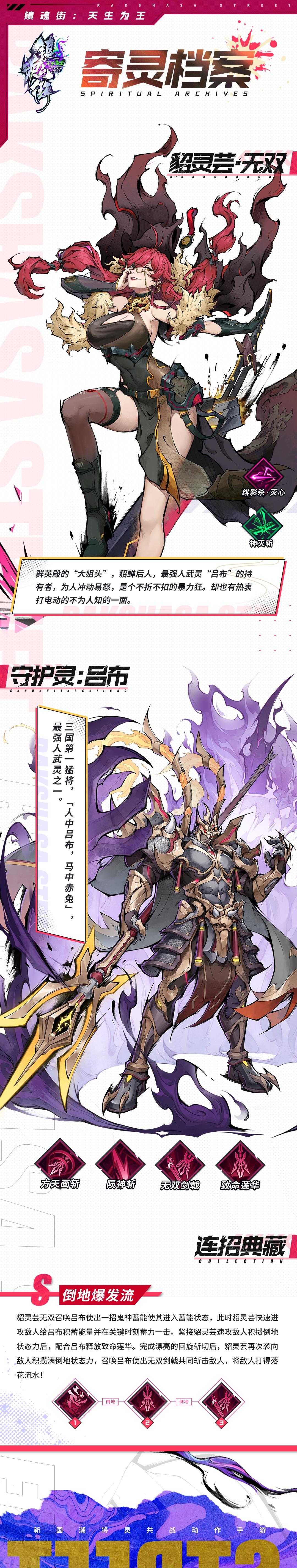 我们常说鲜花配美人,貂灵芸·无双却不走寻常路,其守护灵吕布的形象虽与她大相径庭——身披兽面吞头铠,手持画杆方天戟,擐甲操戈,巍然屹立,不怒自威。但他们一登场就知道绝不是敌人敢轻举妄动的对象。绝大部分敌人只是单单看到吕布,他们的逃生本能便已在催促着他们的双脚,而极个别自视甚高者,也会在巨戟的力量下碾为齑粉。