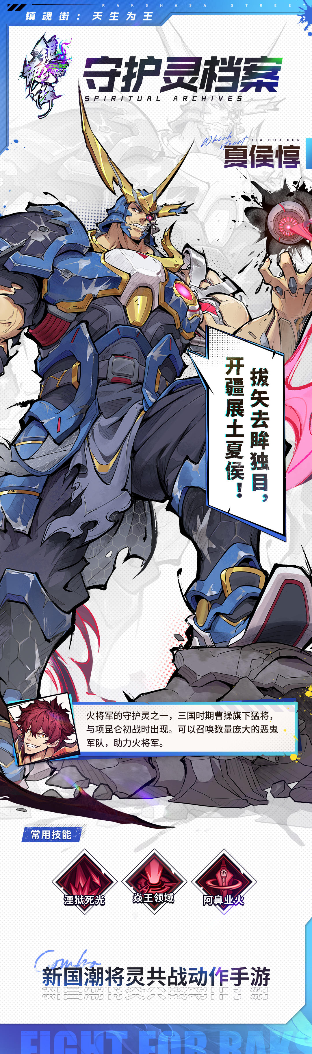 在镇魂街:天生为王中,夏侯惇可以释放阿鼻业火,使其附着自身的武器,燃烧着地狱焰火的巨刃,能瞬间斩击敌人为灰烬。同时独眼并非其弱点,而是能发射湮狱死光,曹焱兵在战斗杀敌时能激活激光扫射区的地狱火焰,配合拿下敌人!成为守护灵的夏侯惇在和火将军的配合上可谓是天衣无缝。尤其特别的是,当夏侯惇展开焱王领域时,战斗如割裂般进入另一个时空,在这个领域内的火将军和夏侯惇如同打开了自家的后花园,游刃有余地协同对阵杀敌!
