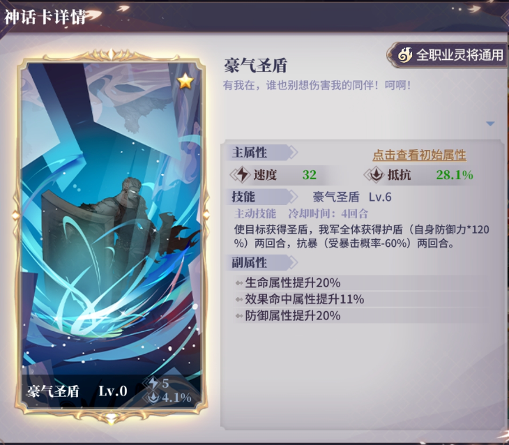 豪气圣盾:这个技能是防守反击队伍的必带卡,主属性是加速度,保证先手能力,主动技能的全体护盾抵消敌方的第一波伤害,全体的抗暴效果卓越,能使得右方受到暴击的概率降低60%,因为爆伤这个是属性的存在,输出英雄暴击跟不暴击输出量上来说完全不是一个层级,降低暴击率能够大幅度削减敌方英雄的伤害,这个技能妥妥的神级技能。苟队必带卡。