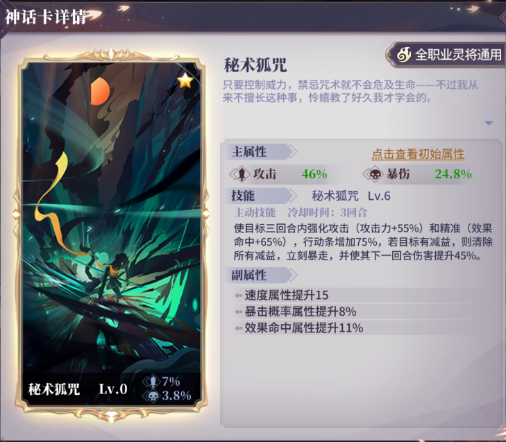 秘术狐咒:偏向于辅助进攻的卡,其实这张卡的主属性改成防御类型的属性强度会更强一点,辅助或者坦克携带这张卡,自身的生存得不到保障,主C带这张卡又不能跟碧游神勇相比。当然其技能效果还是很强的,强化攻击、命中,清除负面效果,顺带几乎可以直接拉满行动条,避免出现普攻的尴尬期。完全是将攻击类型的buff发挥到极致。