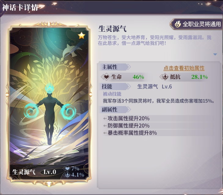 生灵源气:简单直接的增伤效果,属于中规中矩的技能,增伤属性什么阵容都可以携带,当然前提是要有三个同族灵将存在。