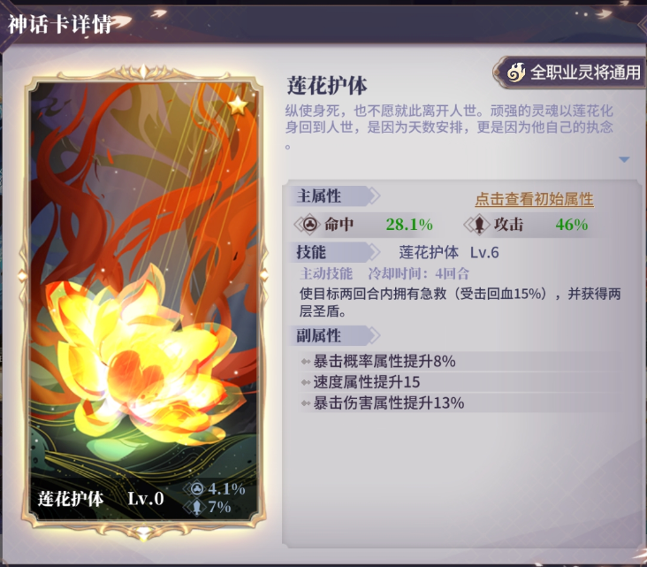 莲花护体:偏防守的技能,可惜主属性没有速度或者偏防御的属性,给防御型或者辅助型灵技携带也是会面临坦度不足的问题,给c位又没有伤害,优势是圣盾是最强的防御型buff,如果能抢在敌方c位出手前释放,能够防止敌方秒C。