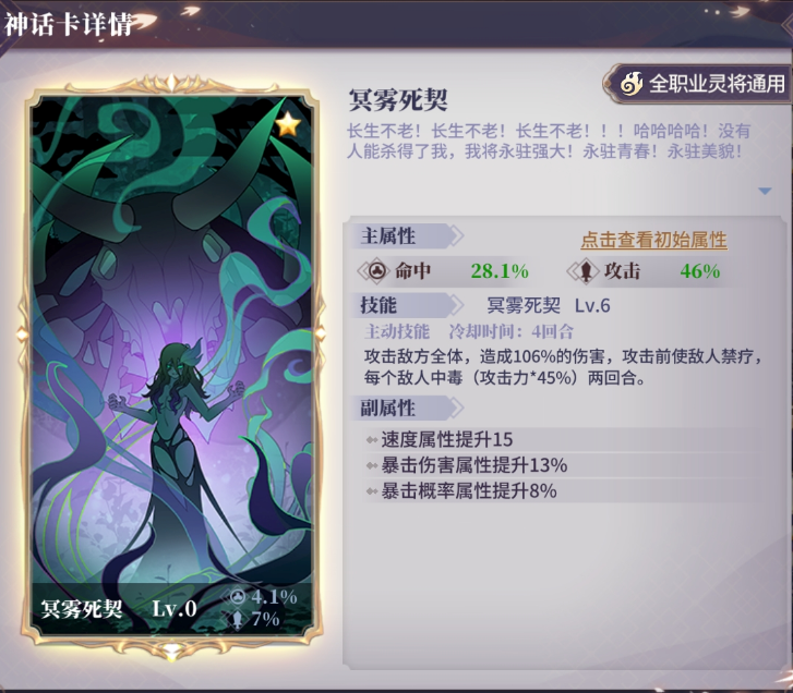 冥雾死契:全体禁疗效果,附带中毒特性,在对面没有驱散减益的情况下,例如广寒惊梦等能起到不错的效果,但是如果对方有广寒惊梦这张神话卡,那么强度会大幅度下降。