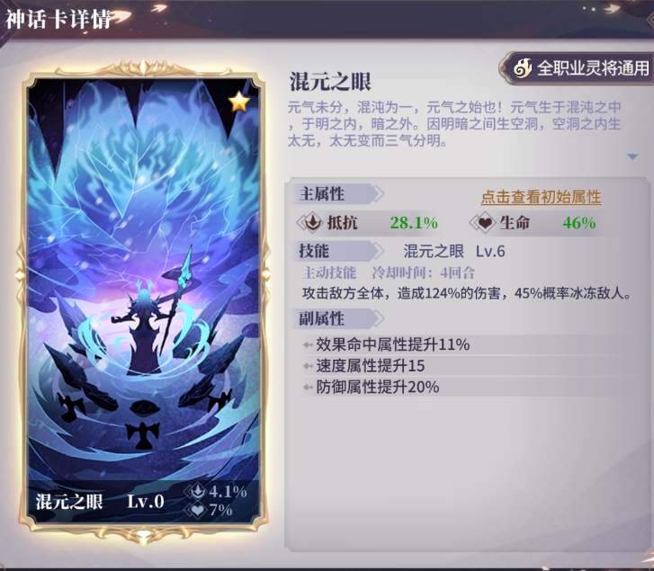 混元之眼:偏向于控制的一张神话卡,可惜是主属性没有速度,速度抢不过其他带有控制技能的技巧型灵将,有发挥余地,但是相比于其他控制型神话卡还是有差距,控制的概率也不如玄火幽冥。
