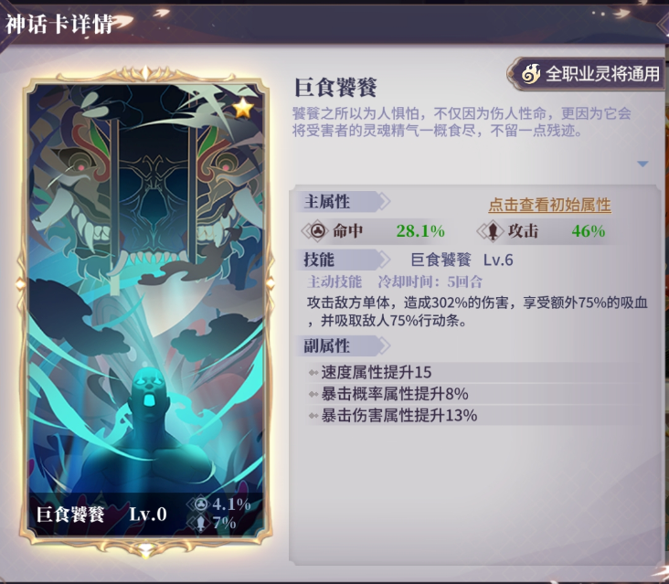 巨食饕餮:单体输出型神话卡,附带吸血以及吸取行动条的效果,攻击系数不足,而且技能效果一般。