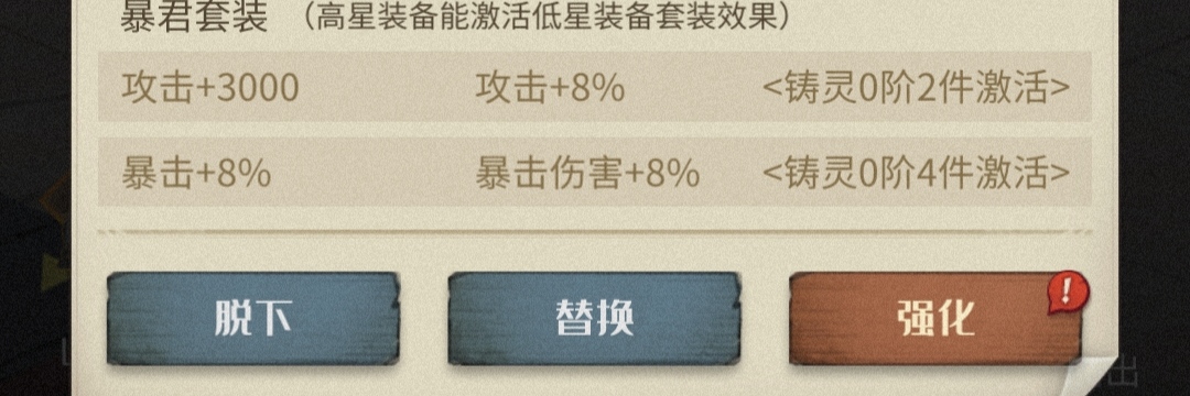装备提升装备提升的话可以通过消耗同类型武器来进行锻造,只能消耗同类型,例如武器只能吃武器,衣服只能吃衣服。