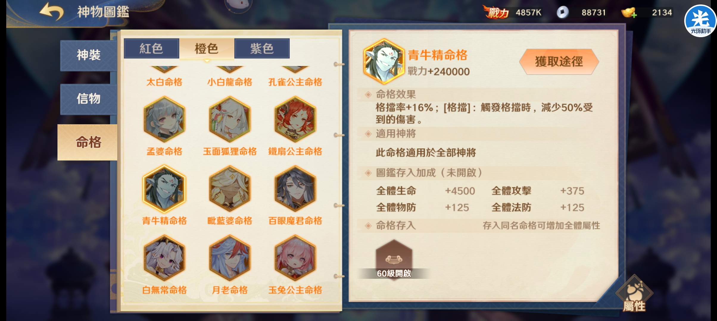 盾辅命格 ͏青牛精命格:格挡率加16%,格挡时减少受到50%的伤害。