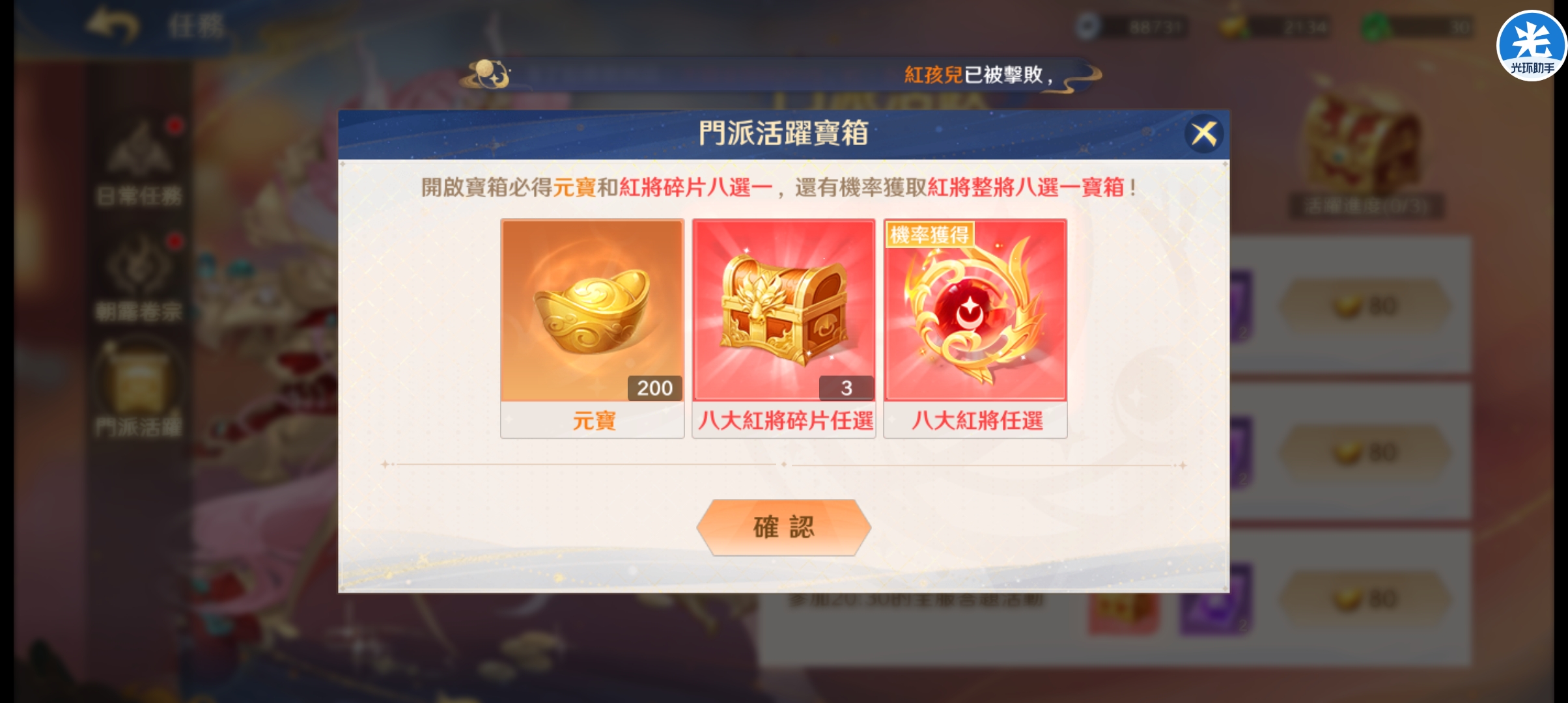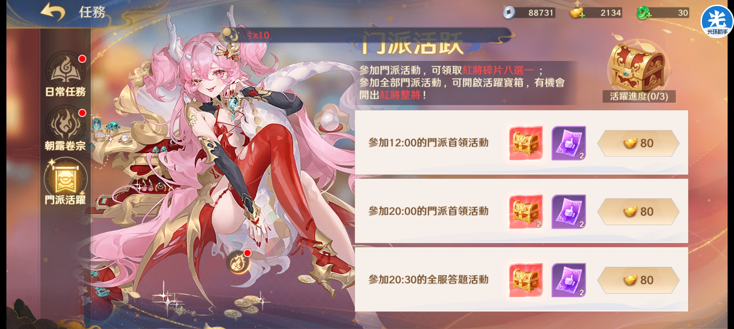 ͏然后就是我们的门派活跃,门派活跃是一个可以稳定持续获得碎片的方法,而且这个也是有运气成分在里面的,你运气好一点,你直接就是八大红将自选。