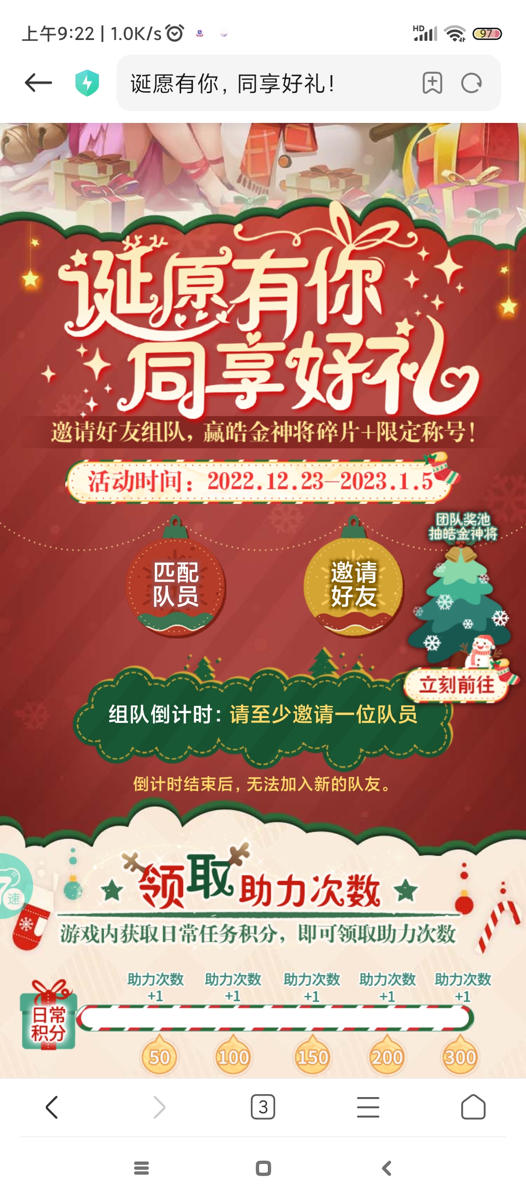 兄弟们,我天子又回来了!天子功略发布于 2022-12-24关注诞愿有你,同享好礼!《少年西游记》圣诞福利限时发放中,新人登录即送【赤金神将】任选+丰厚养成资源,还有活动限定称号!大家可以去新写的攻略里面,观看详细玩法。以及详细攻略,还有充值过的队长码可以绑定……
