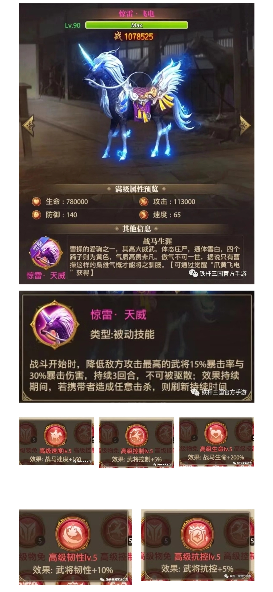 王异战马推荐【惊雷飞电】,这个战马的被动技能可降低敌方高输出武将的暴击率和暴击伤害,有效减少了敌方的输出。