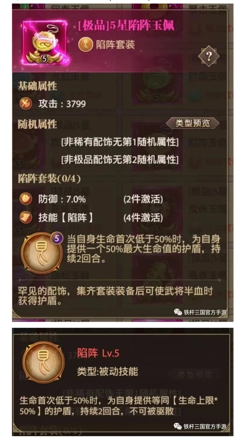 配饰推荐陷阵套装,可以在生命值首次降于50%时提供一个护盾,并持续2回合