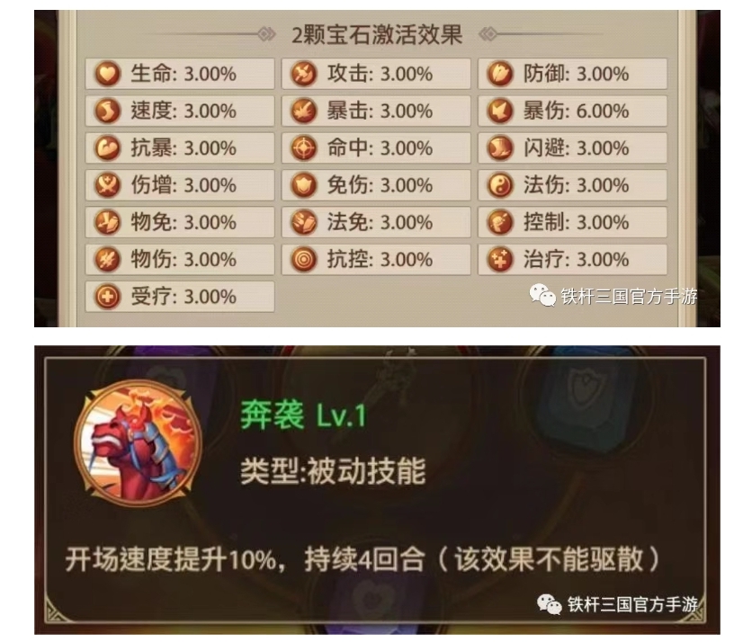 宝石推荐佩戴抗暴、百分比生命、控制和速度。其中两颗宝石效果选择为控制3%,四颗宝石选择技能为【奔袭】:开场速度提升10%,持续时间为4回合