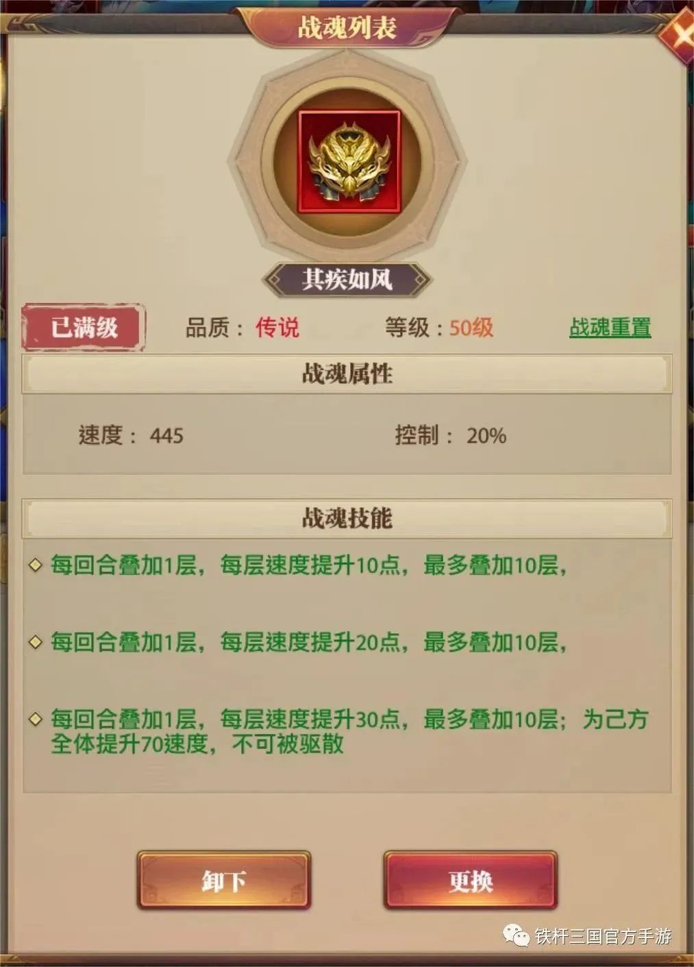 王异推荐使用其疾如风战魂,因为属性带有速度和控制是非常适合王异使用的战魂