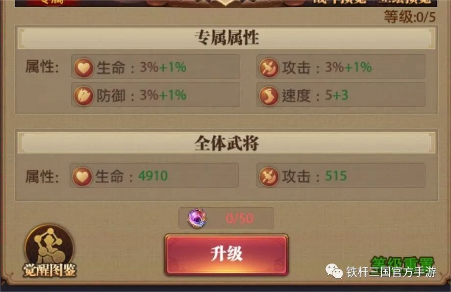 在武将觉醒界面消耗觉醒丹进行皮肤升级,觉醒皮肤满级是5级,每升一级消耗50个武将觉醒丹。