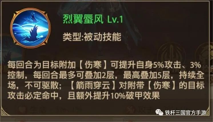 【烈翼蜃风】效果:每回合为目标附加【伤寒】可提升自身5%攻击,3%控制,每回合最多可叠加2层,最高叠加5层(上限5层)持续全场,并且不可驱散。【箭雨穿云】对附带【伤寒】的目标攻击必中,且额外提升10%破甲效果