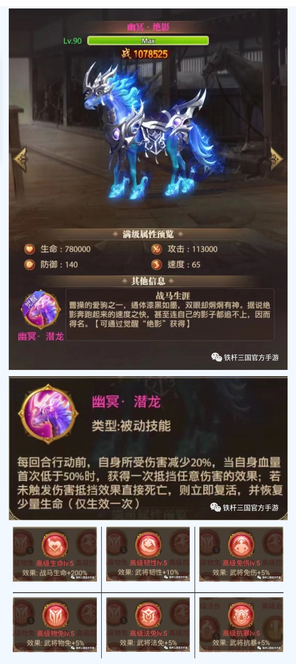 战马推荐幽冥·绝影。幽冥·绝影的技能使得周泰在行动前获得20%的减伤,非常适合不需要速度的吴国,并在血量低于50%时,获得一次抵挡容易伤害的效果;若触发伤害格挡直接死亡,还能立即复活(受埋葬影响,并只生效一次),战马技能继续选择能强化周泰坦度的技能。