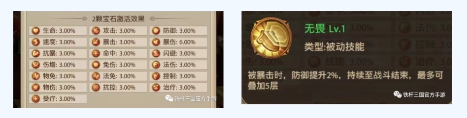 宝石没有增加反伤的效果,只能继续加强周泰的生命和防御能力,宝石推荐:强化生命、免伤、抗暴、抗控;2颗宝石激活效果推荐:3%抗暴;4颗宝石激活效果推荐:无畏。