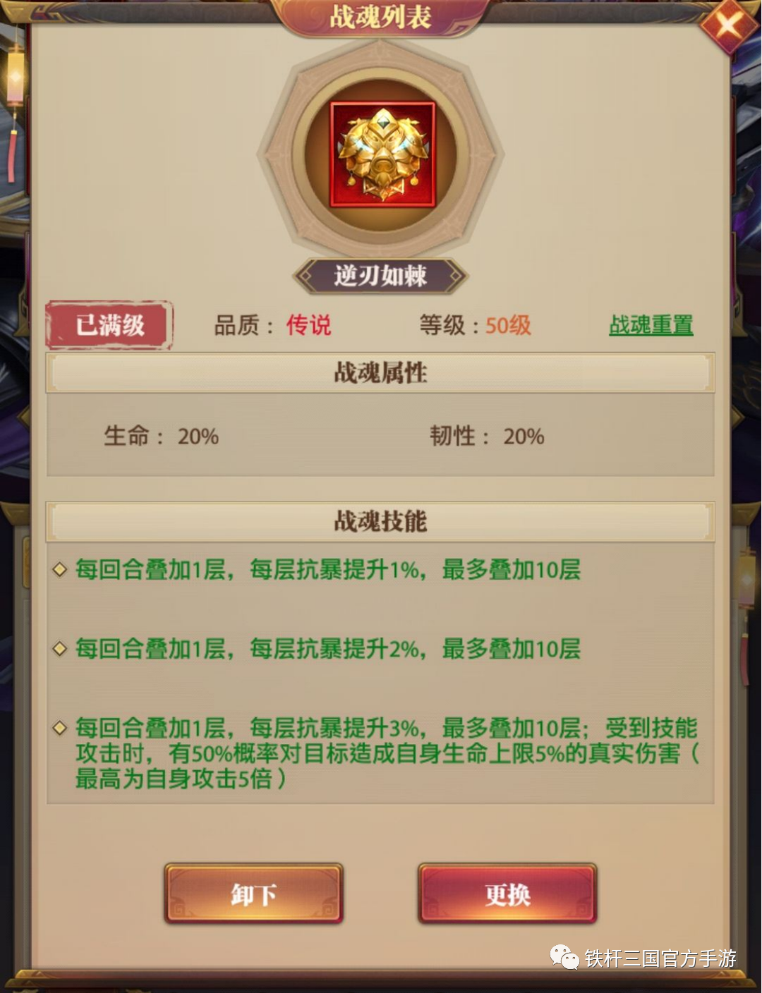 周泰推荐装备逆刃如棘增加武将生命和韧性,并且传说级的战魂技能效果会使攻击周泰的武将有几率受到周泰生命上限5%的真实伤害(最高为自身伤害的5倍),且韧性是pvp必备属性,能降低敌方武将的暴击效果。