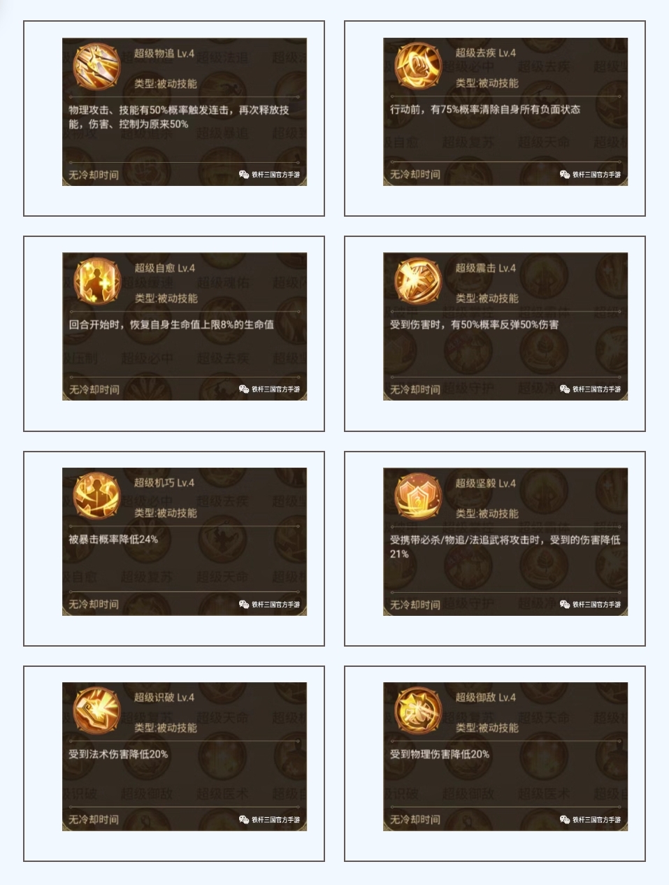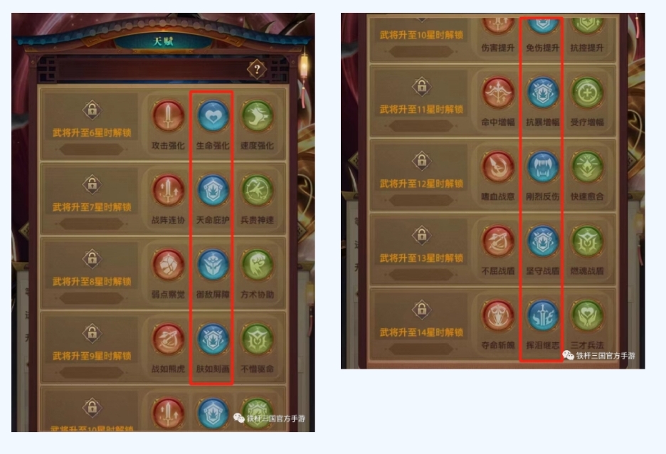 周泰作为镇卫武将,技能及天赋突出了其高免伤、高防御的特点,针对周泰武将的养成,可着重培养免伤、生命、防御,提高周泰的坦度,配合反伤玩法,可突出周泰的存在感,为阵容其他武将保驾护航。