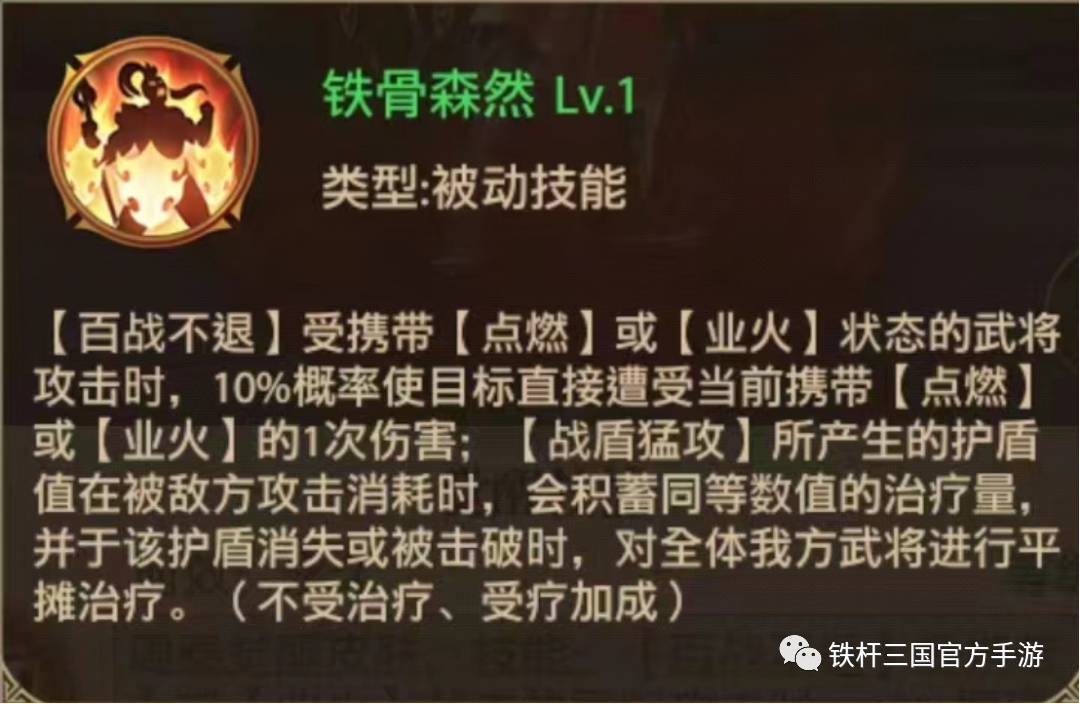 【铁骨森然】效果:强化【百战不退】使携带【点燃】或【业火】状态的武将攻击自身时,有10%概率使目标直接遭受当前携带【点燃】或【业火】的1次伤害,该伤害不会消耗【点燃】或【业火】;强化【战盾猛攻】,使其产生的护盾值在被敌方攻击消耗时,会积蓄同等数值的治疗量,并于该护盾消失或被击破时,对全体我方武将进行平摊治疗。(不受治疗、受疗加成)