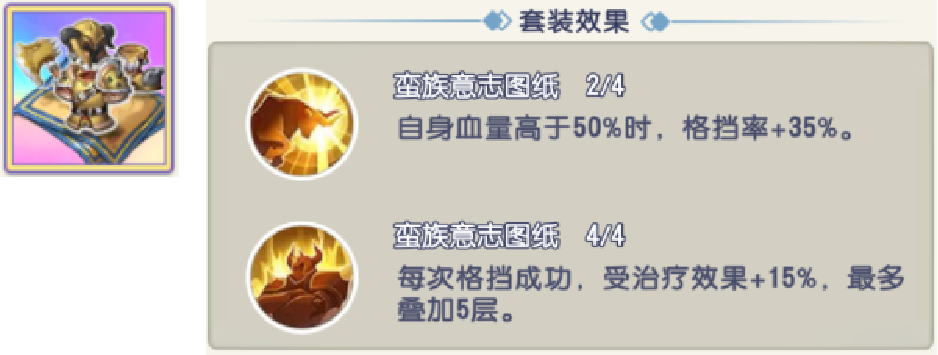 彩色套装:蛮族意志,武器头盔选择暴击暴击率词条,衣服鞋子选择生命值、抗暴率、格挡率词条。