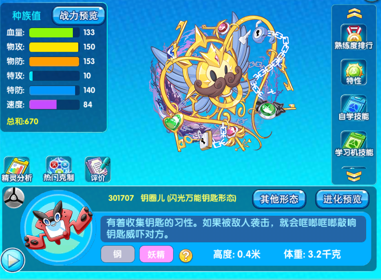 闪光钥匙圈最主要的就是血量突破了120的及格线非常的不错,两种防御能力还算是不错中规中矩,150点的物攻看起来并没有什么用,但是如果配合这个精灵的特性,那么再增加20点又有何妨?最后的速度我就不说了,完全没有用。