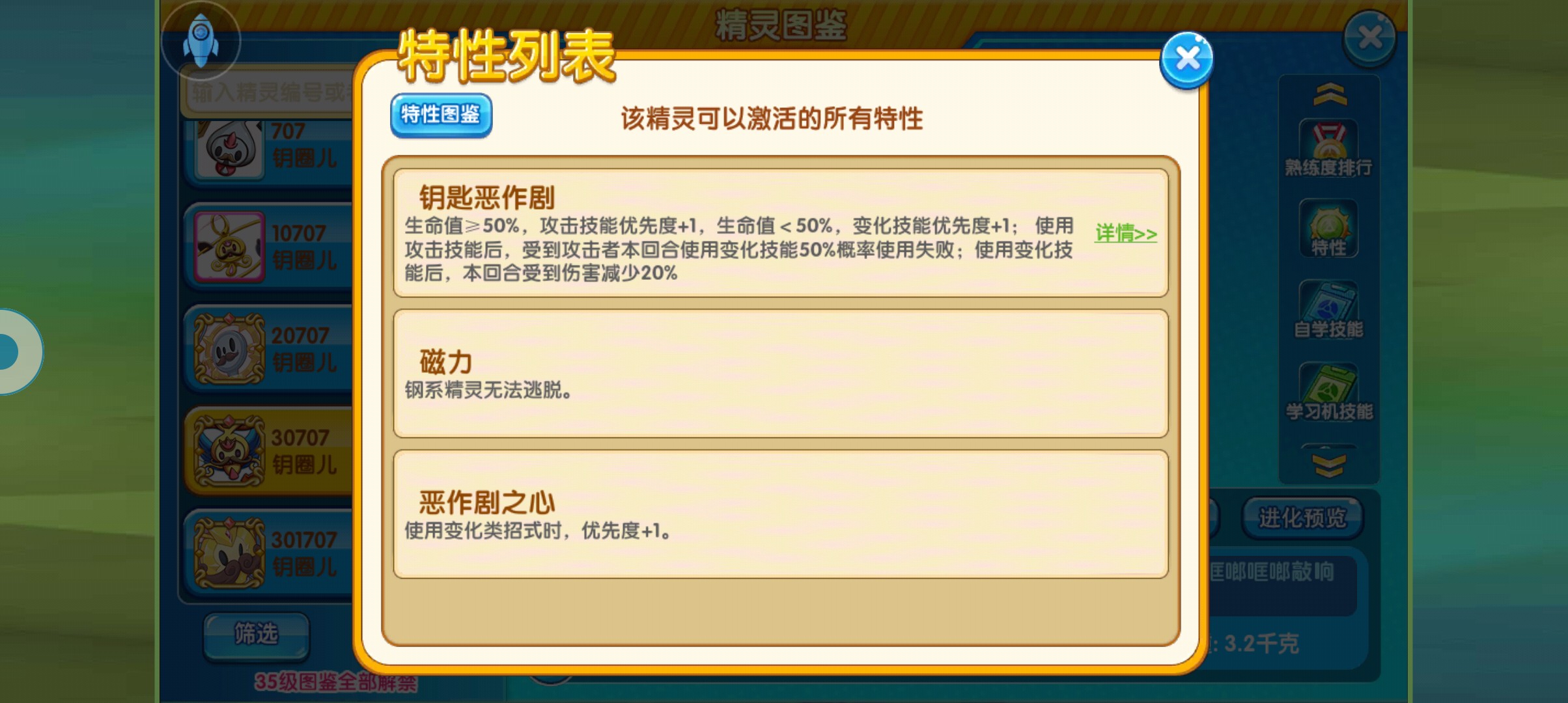 特性方面的话,如果想要稳定中转,可以使用老特性恶作剧之心,这样的话,面对对方的黑暗超梦和被我方抵抗的精灵,就直接先手逃脱了,就完全不存在,如果使用新特性然后自身的血量没有触发变化招式先制加一的效果,直接被对方挑拨动都动不了,而且个人感觉闪光钥匙圈,在我个人特性推荐上面,我最推荐大家使用的还是老特性,新特性的攻击先制效果,完全用不上,用了也是白用,因为本身的输出不高,所以你能打得动谁?