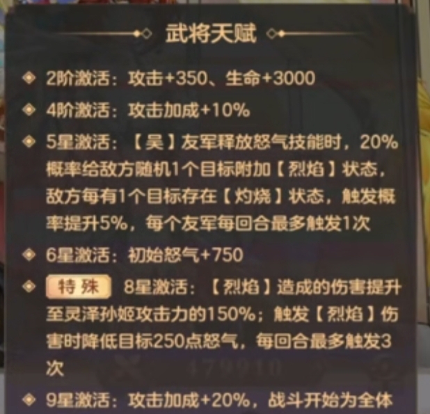 如果目标被孙姬的烈焰触发,会降低250点怒气。并且这个怒气一回合可以降低3次。如果孙姬能够一回合触发3必烈焰,那么就可以对敌方造成3次减怒效果。同时达到10星以后,如果对面敌人实用驱散技能,孙姬可以使对面有15%几率驱散失败,怎么理解呢?比如说诸葛亮的驱散华佗的驱散效果孙姬都会影响到他们,在pvp中是非常好用的技能。