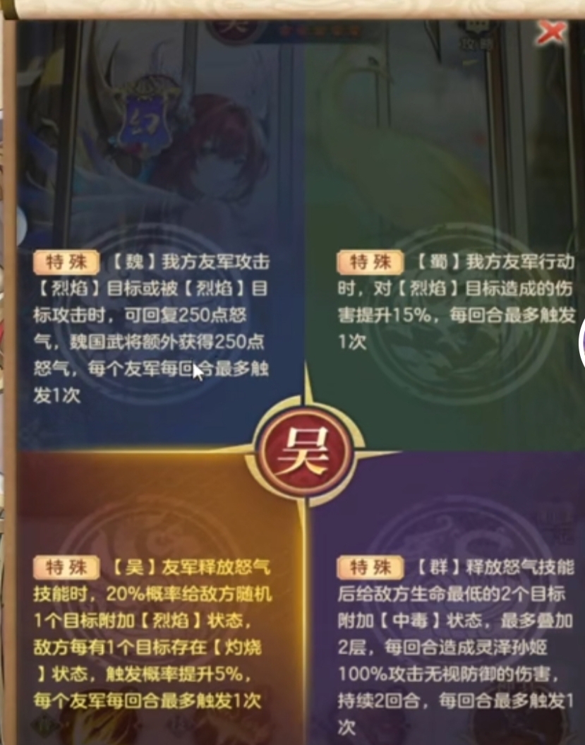 孙姬和我上次解说的幻孙一样,可以随意变化4种阵营属性,上次孙权变蜀国是最吃香的,那么这次的孙姬可以看到 魏阵营和群阵营比较吃香,魏阵营可以回怒,最高回500。而群阵营,孙姬自身可以多一种buff中毒,配合自身的烈焰+群阵营中毒,实现真正的火毒流,中毒不再是袁术贾诩的专长,同时中毒效果也是100%的。所以推荐孙姬可以走群阵营,会很吃香。
