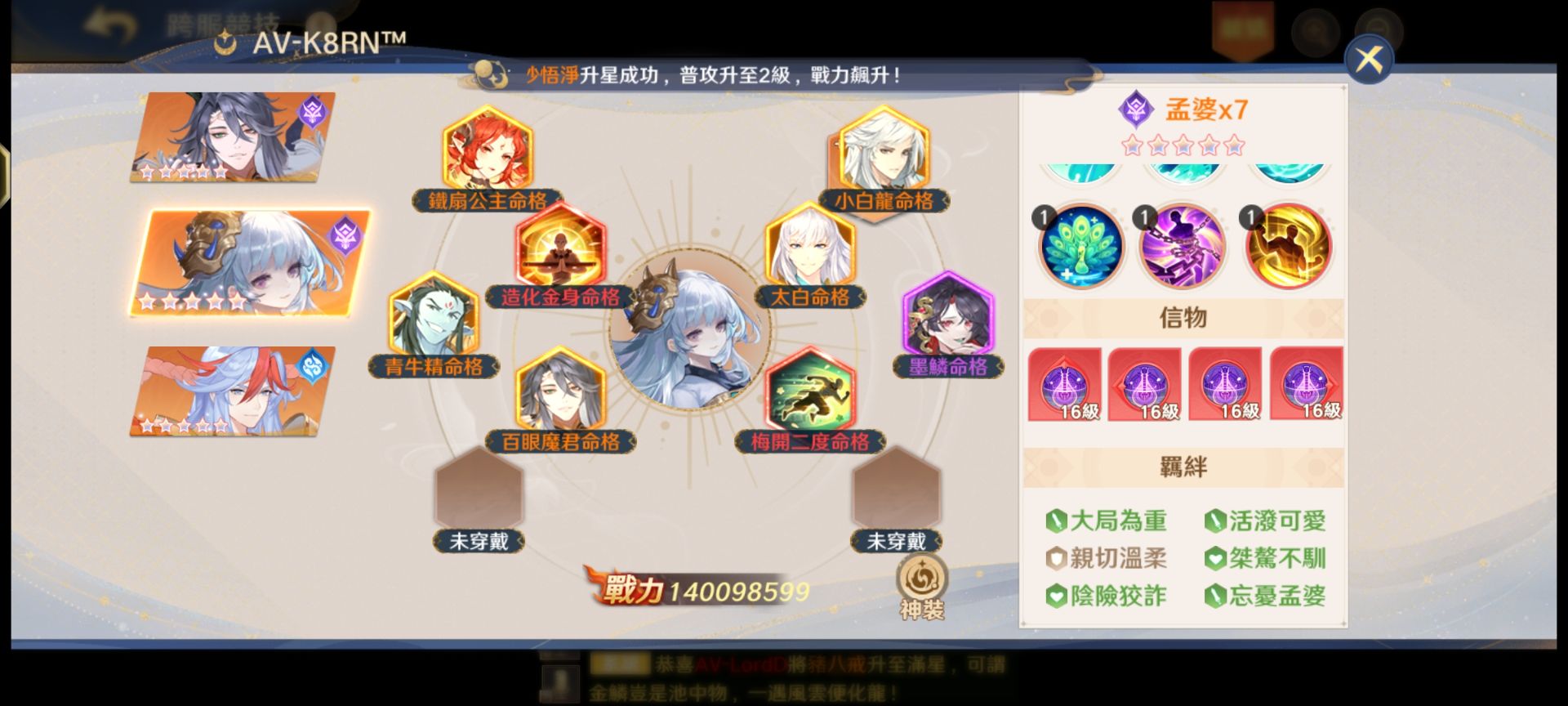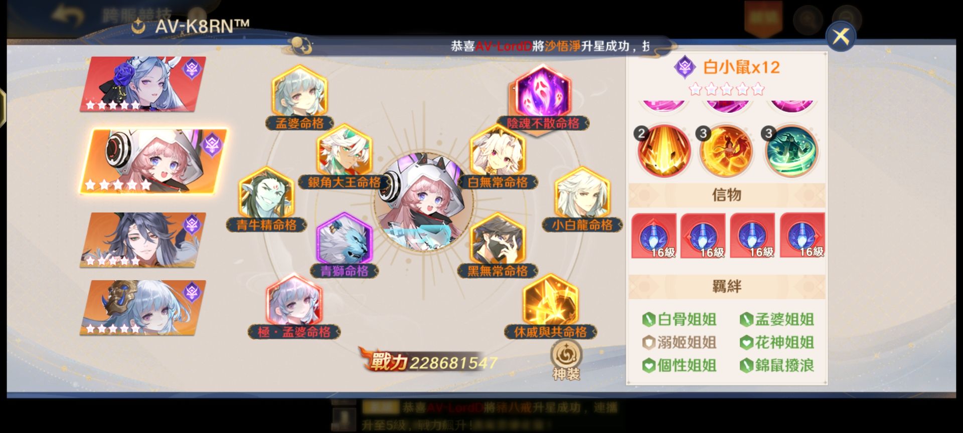 哦哦好的,那可以用红娘的神通卡了,你这极限白骨阵容用的啥神通卡