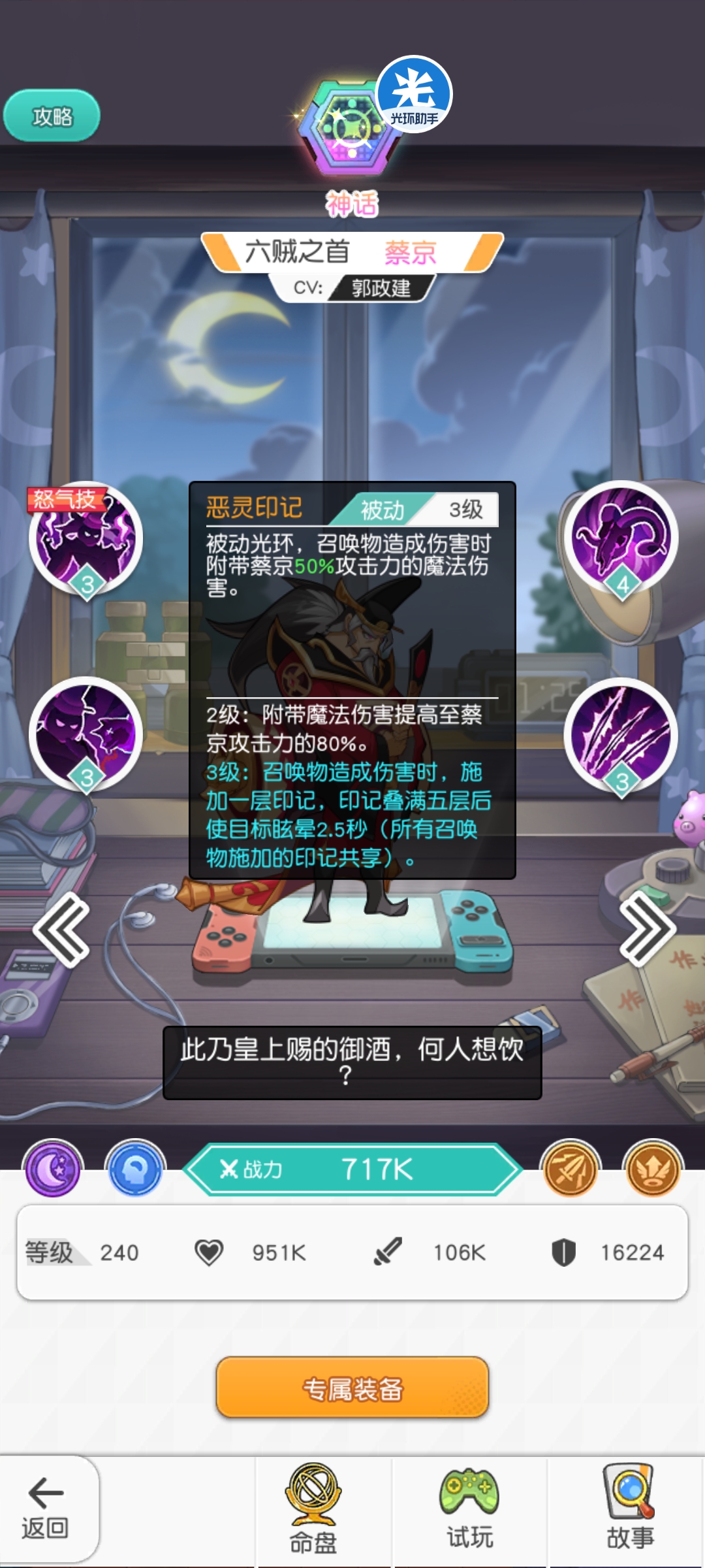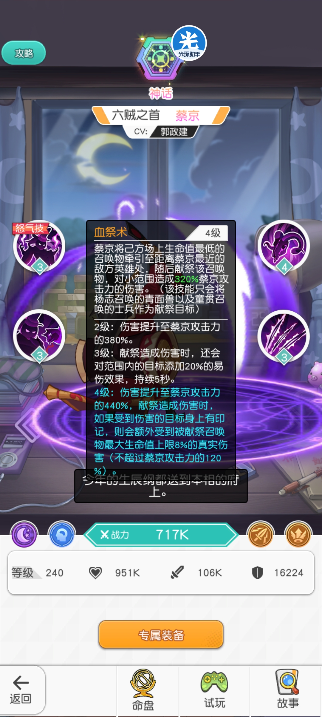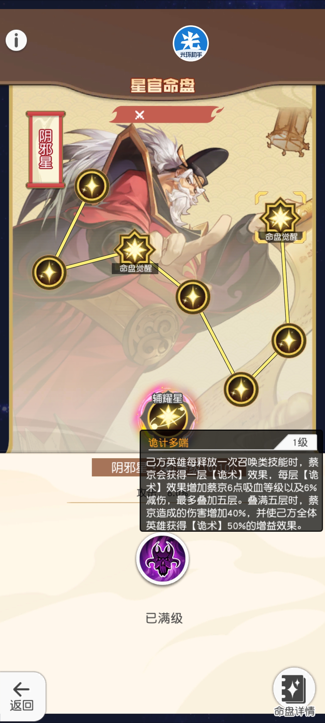 命盘效果:己方英雄每次召唤,蔡京都叠加一层诡术buff(6等级回血和6%减伤),叠满五层之后蔡京另获取40%的增伤效果,诡术buff效果的50%分享给己方全体英雄。(天书蓝色卡牌吸血等级35,蔡京叠满30)