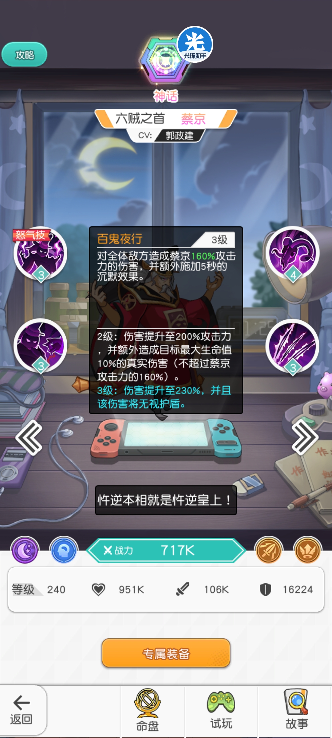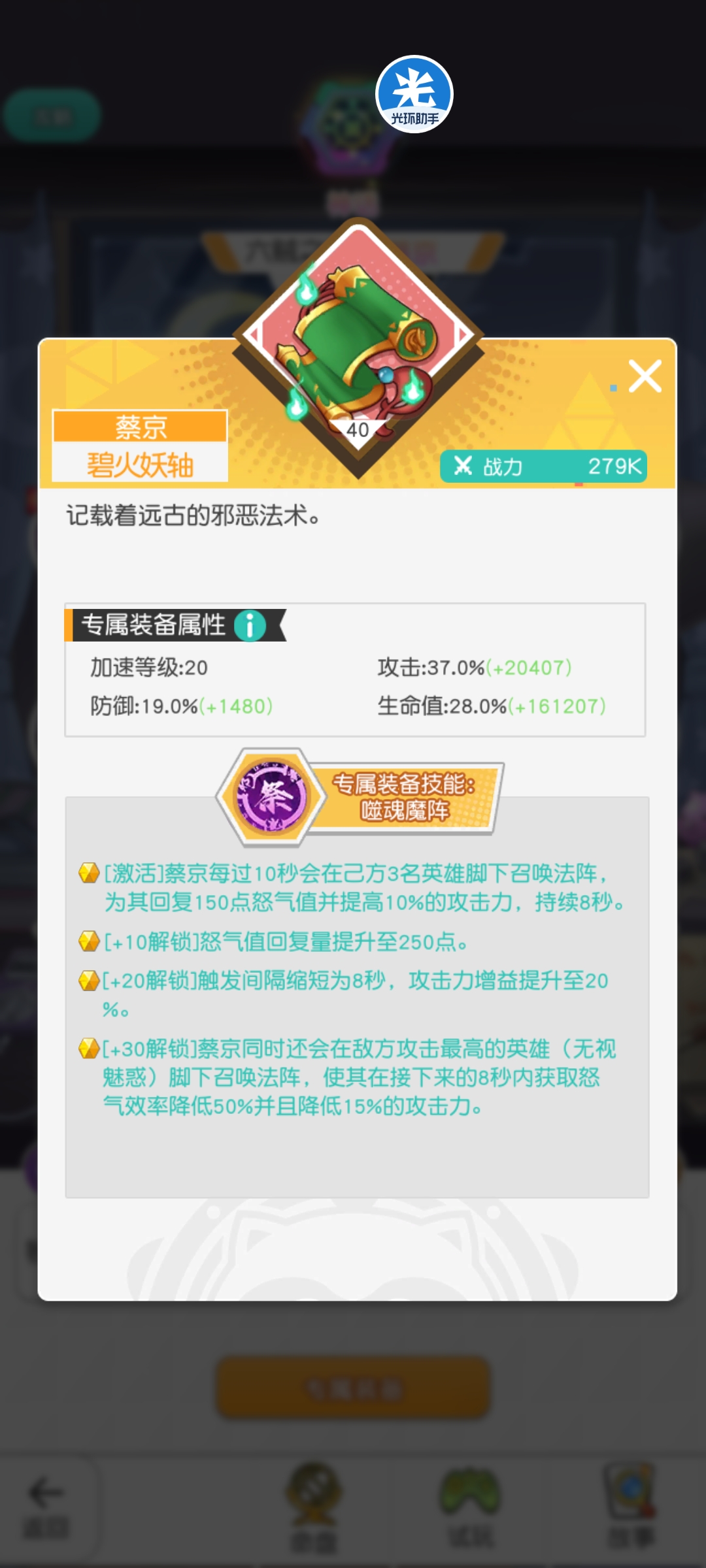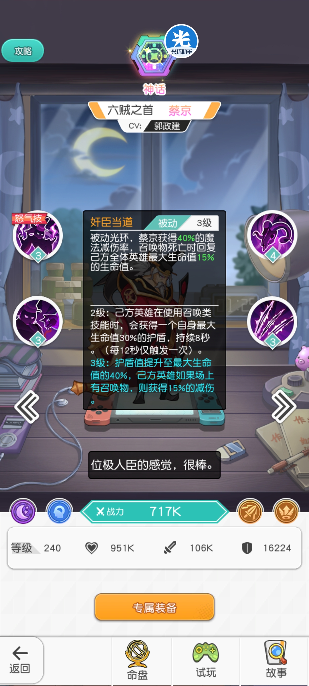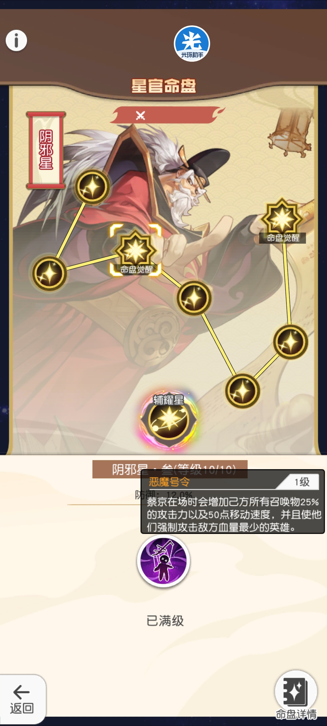 命盘效果:己方英雄每次召唤,蔡京都叠加一层诡术buff(6等级回血和6%减伤),叠满五层之后蔡京另获取40%的增伤效果,诡术buff效果的50%分享给己方全体英雄。(天书蓝色卡牌吸血等级35,蔡京叠满30)
