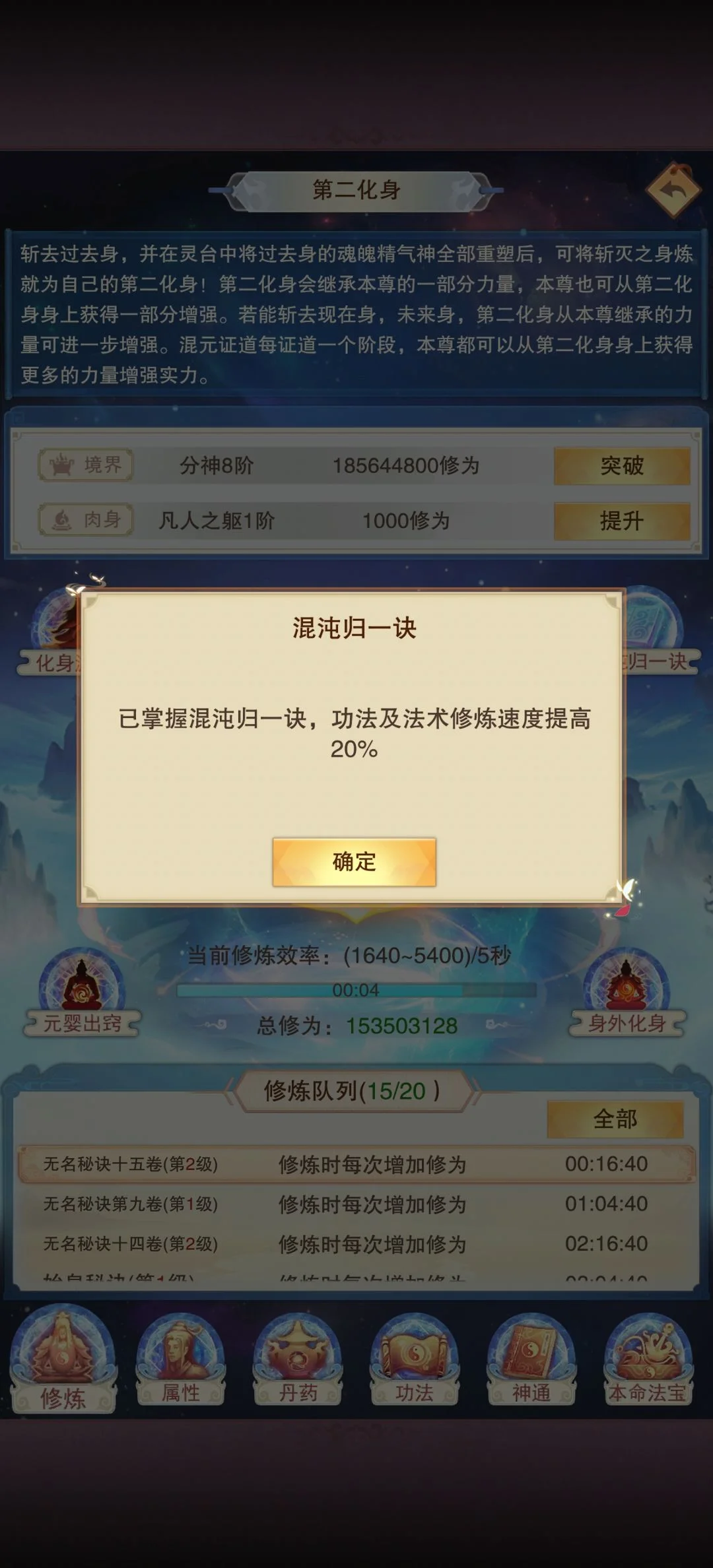 100上灵 买混沌归一诀给第二化身增加学习功法/神通速度。