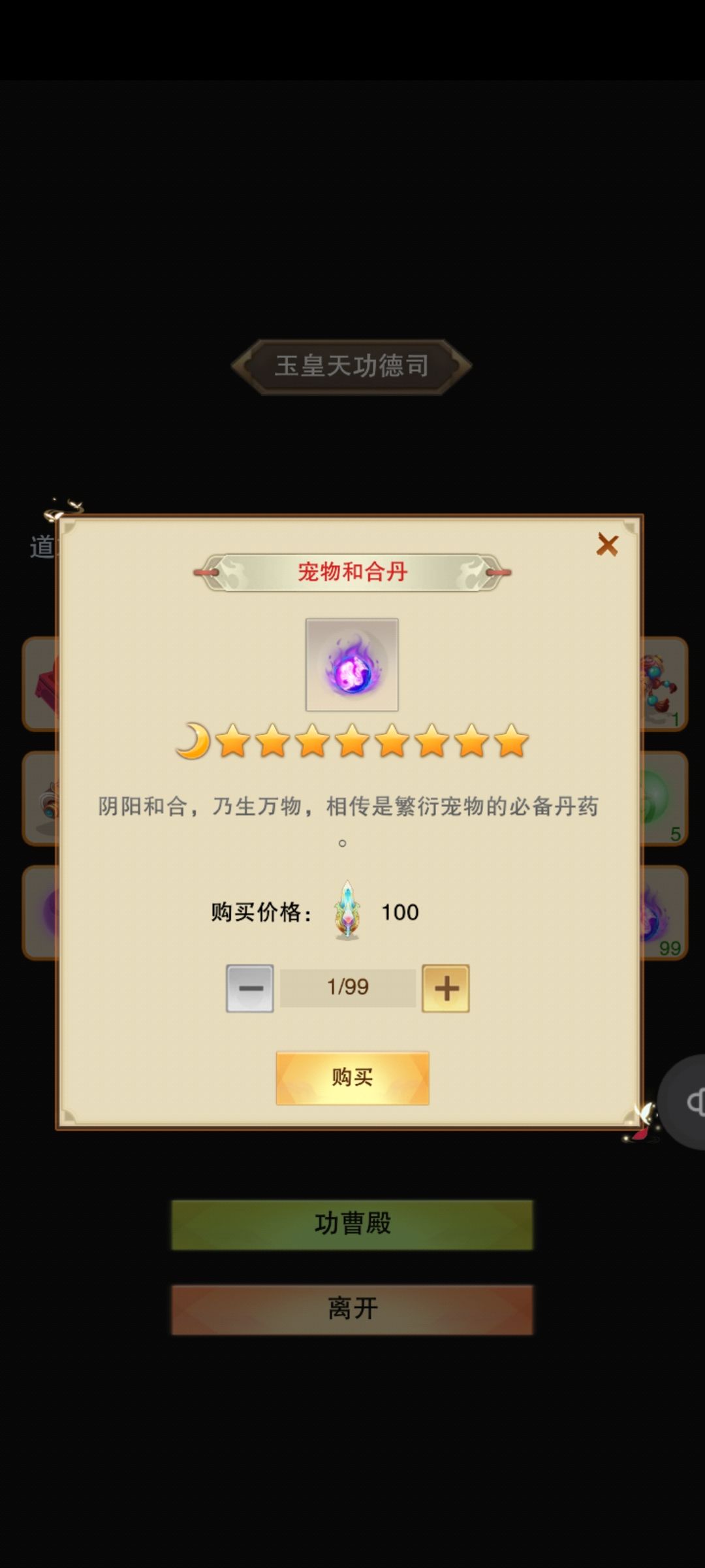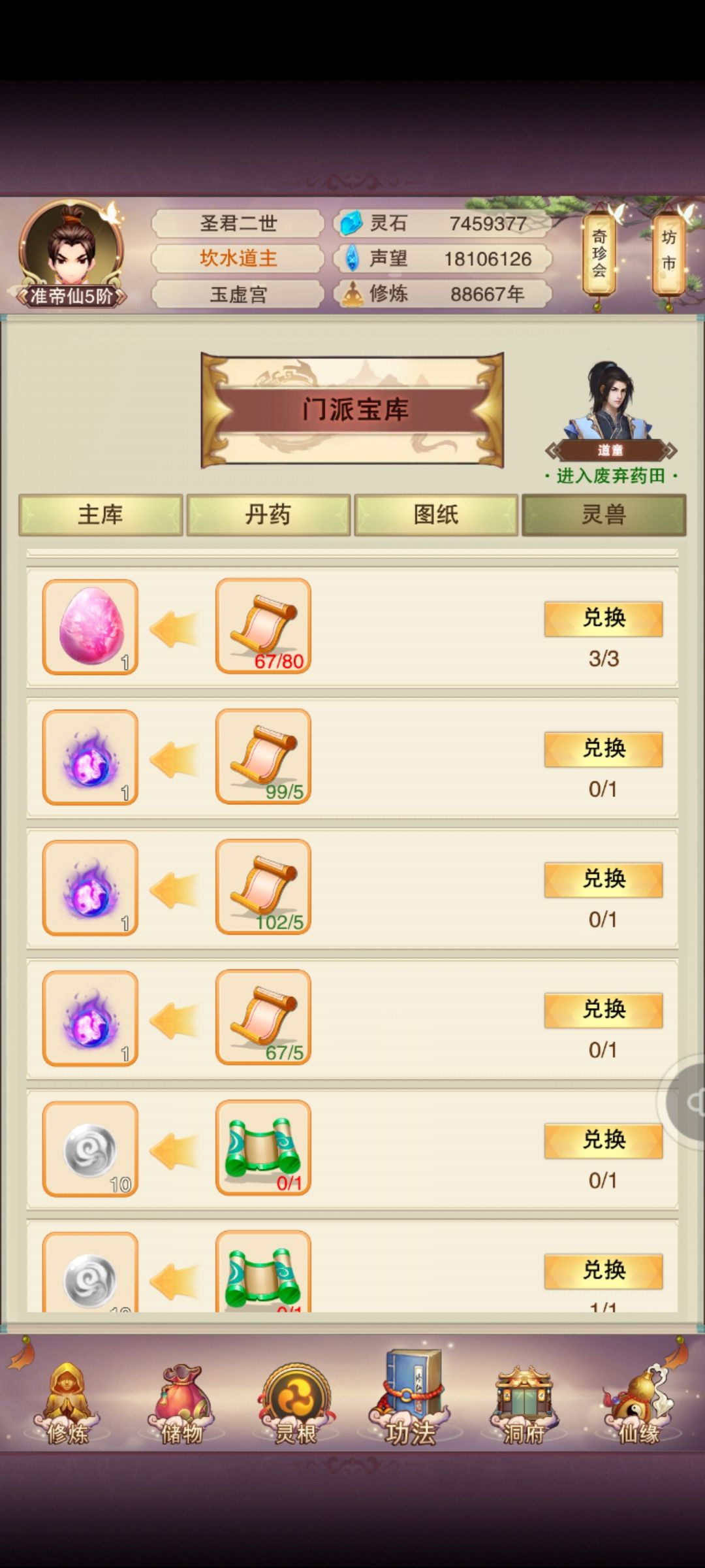 兑换方式:先肉满仓——灵兽场培育野兽拉满(500肉=1野兽)——培育三种类型的兽宠——获得培育心得去门派兑换宠物和合丹