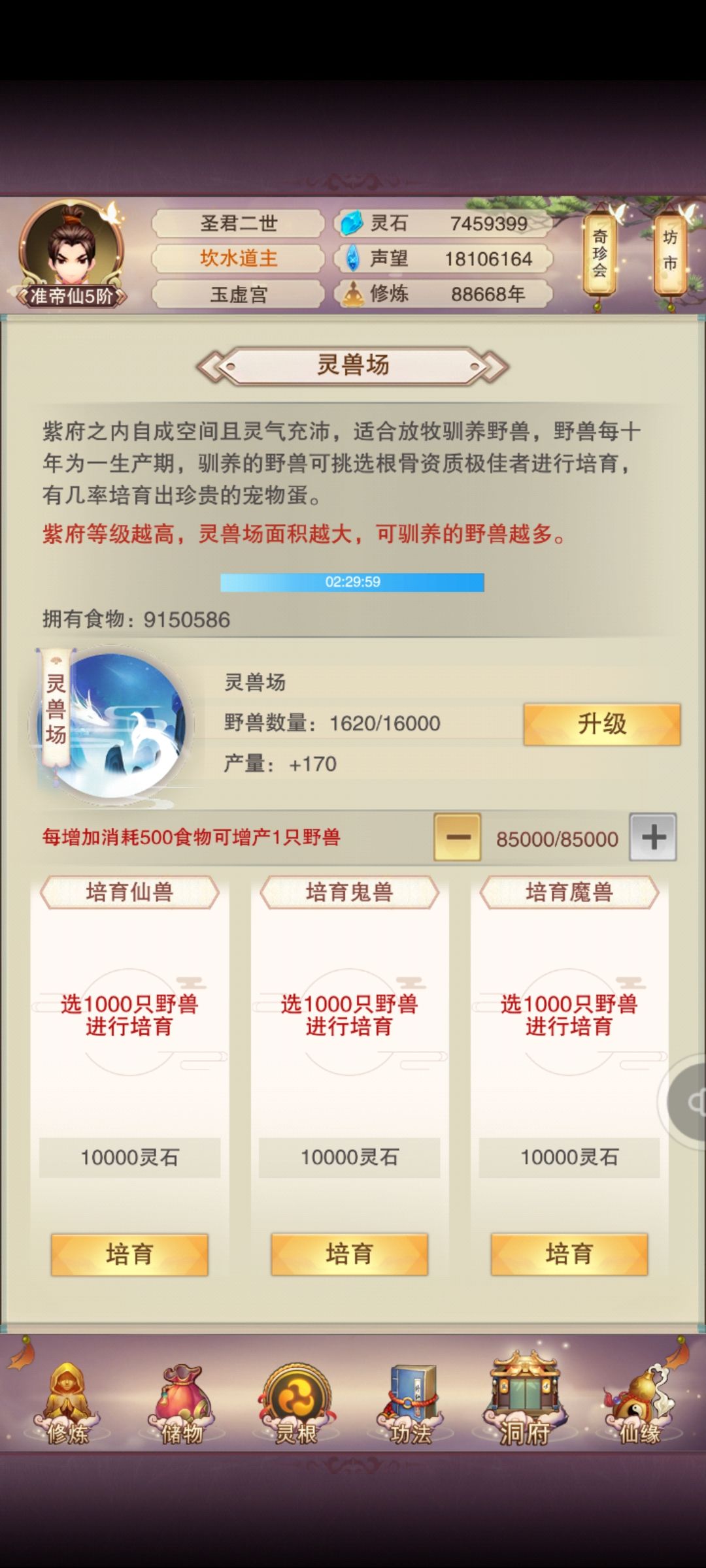 339之后,紫府大概都有9级,消耗肉最大值是5w,训练时长两个半小时🐔,每5w肉产100兽,一天能产900。每天消耗45w肉