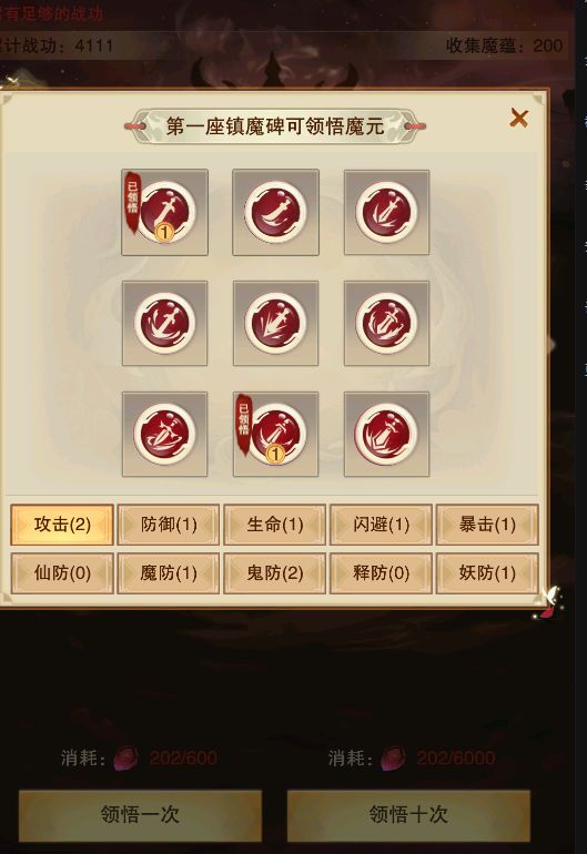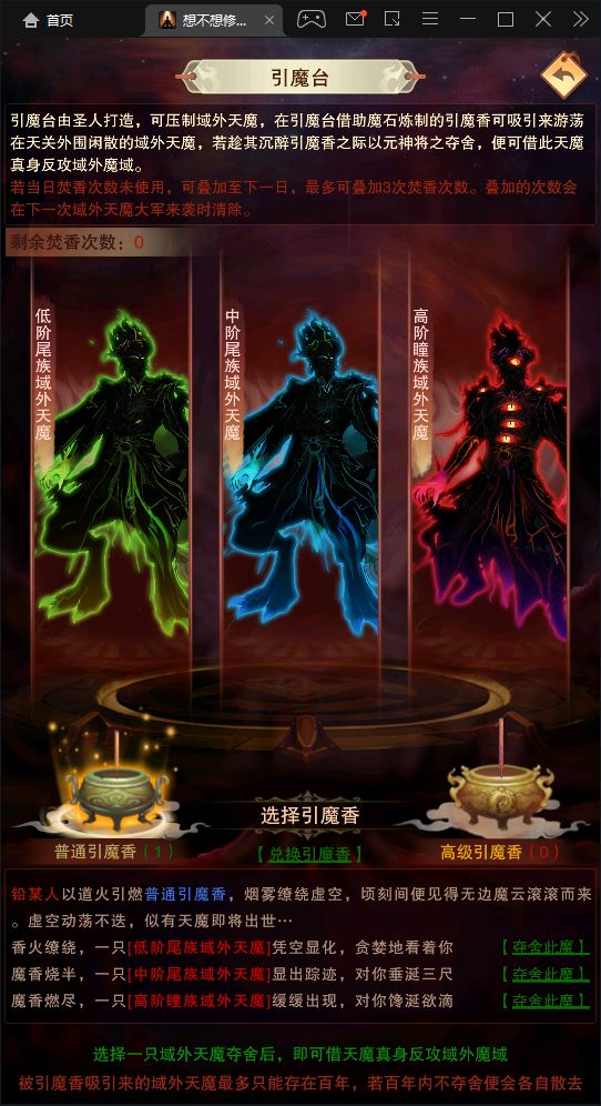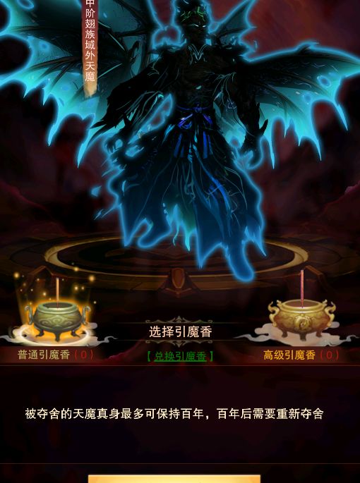2)点击引魔台——选择引魔香(免费两根普通,普通一根1w灵石;高级一根10rmb)选择高等阶的天魔即可直接夺舍,不存在失败。夺舍天魔等阶影响天魔强度(即体力值)