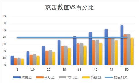 同为A级攻击数值可以提供35-50攻击加成,攻击百分比可以提供8-12%攻击百分比加成,以40数值和10%百分比为例,计算不同类型灵将收益如下图所示;