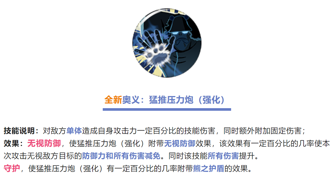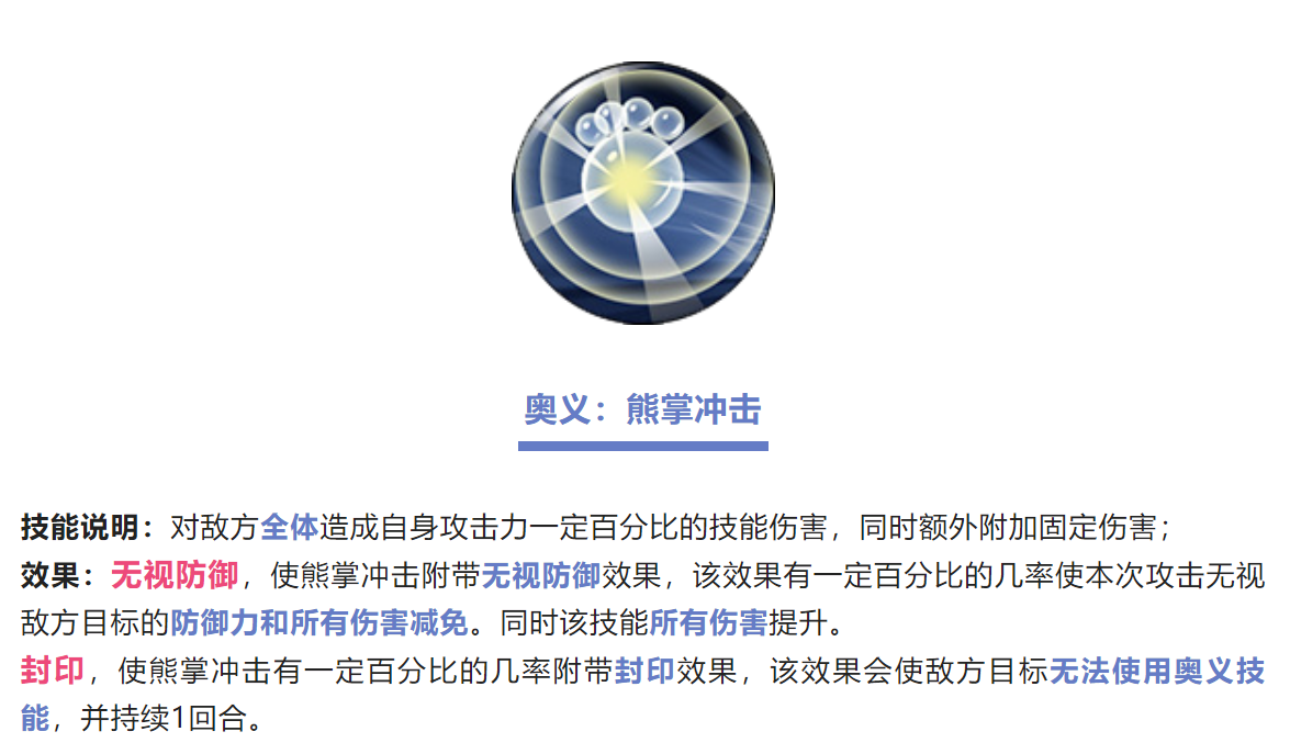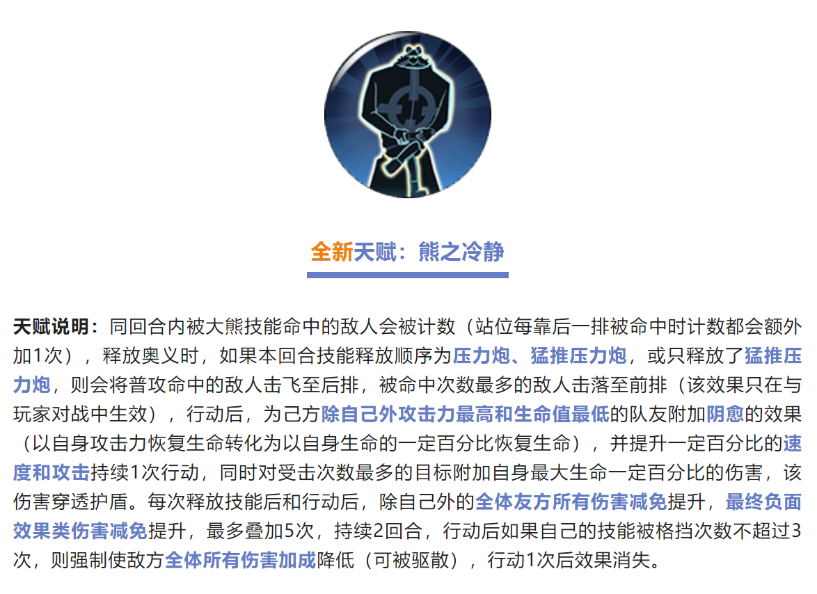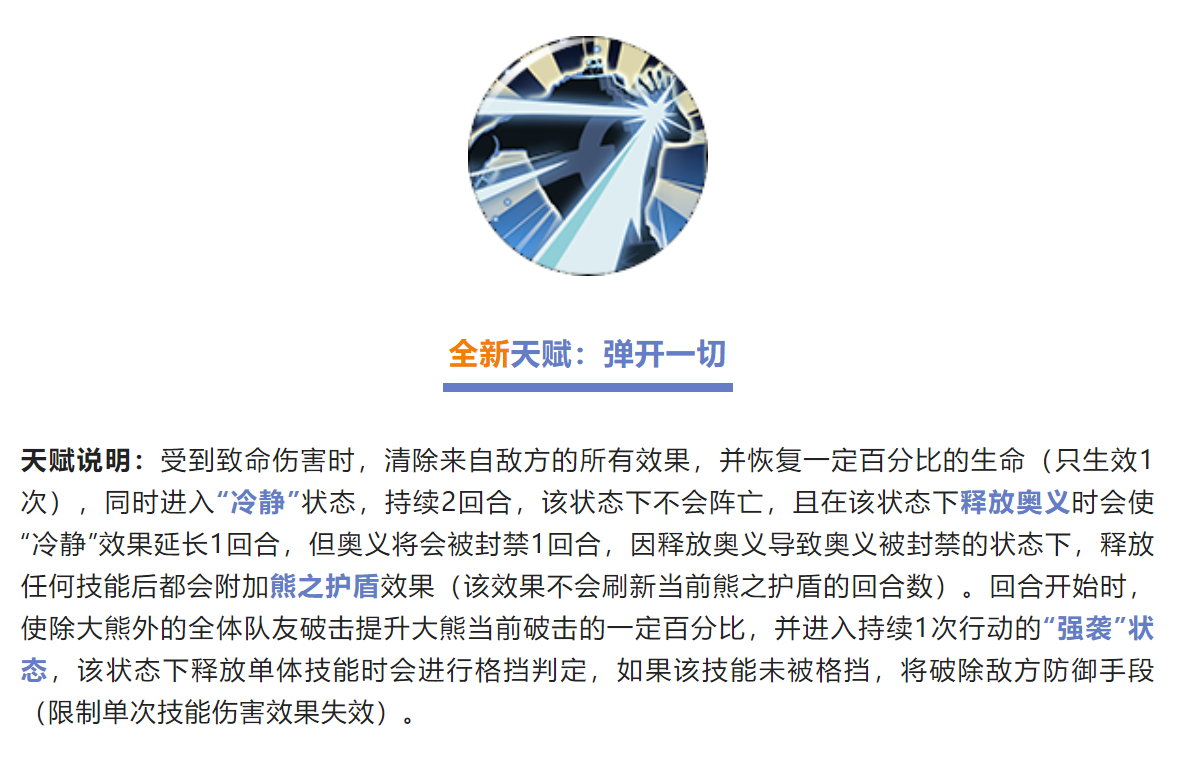 这个技能看着好像说了很多,其实就是说大熊有个保命天赋,能复活而且两回合不死,奥义可以延续一回合。