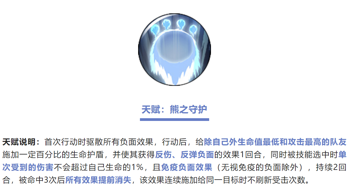 这个就是前面奥义说的天赋了,就是行动后给队友加护盾,同时这个玩意可以反弹伤害和负面。而且大熊能锁血免疫负面。但是这个会不会跟他上一个天赋冲突啊,上面不是说了能破锁血吗?如果这样有没有大熊影响可能会有点大了。