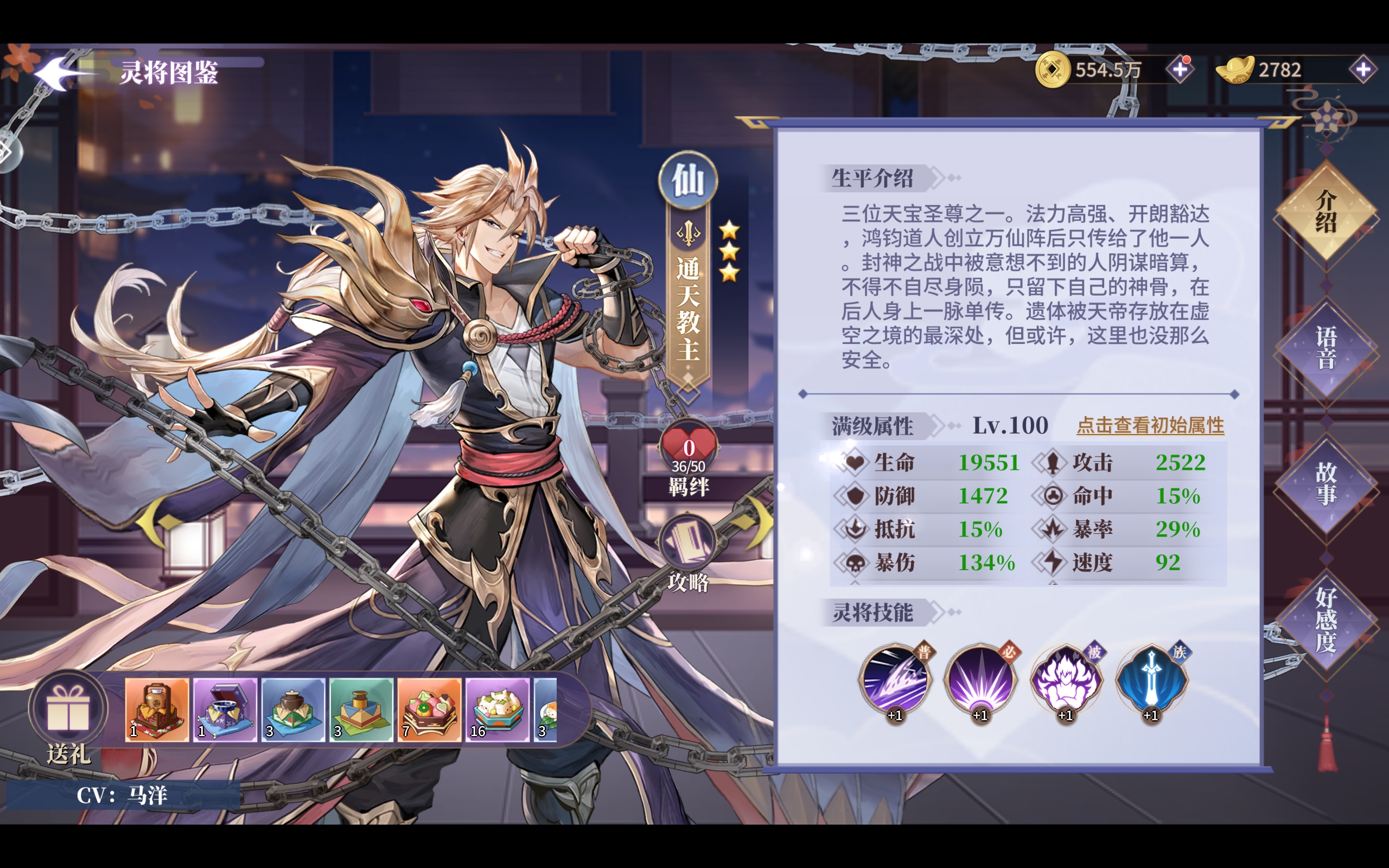 3.云霄:仙族必备辅助型灵将,经历了一次较大的改动,目前云霄几乎成为了通天教主的私人挂件,被动提升攻击最高成员进度条并驱除减益,大招提升任一队友攻击力(其实还是给到通天)。相比于太上老君,整体更加倾向于单体保护以及驱除减益,职能不同。