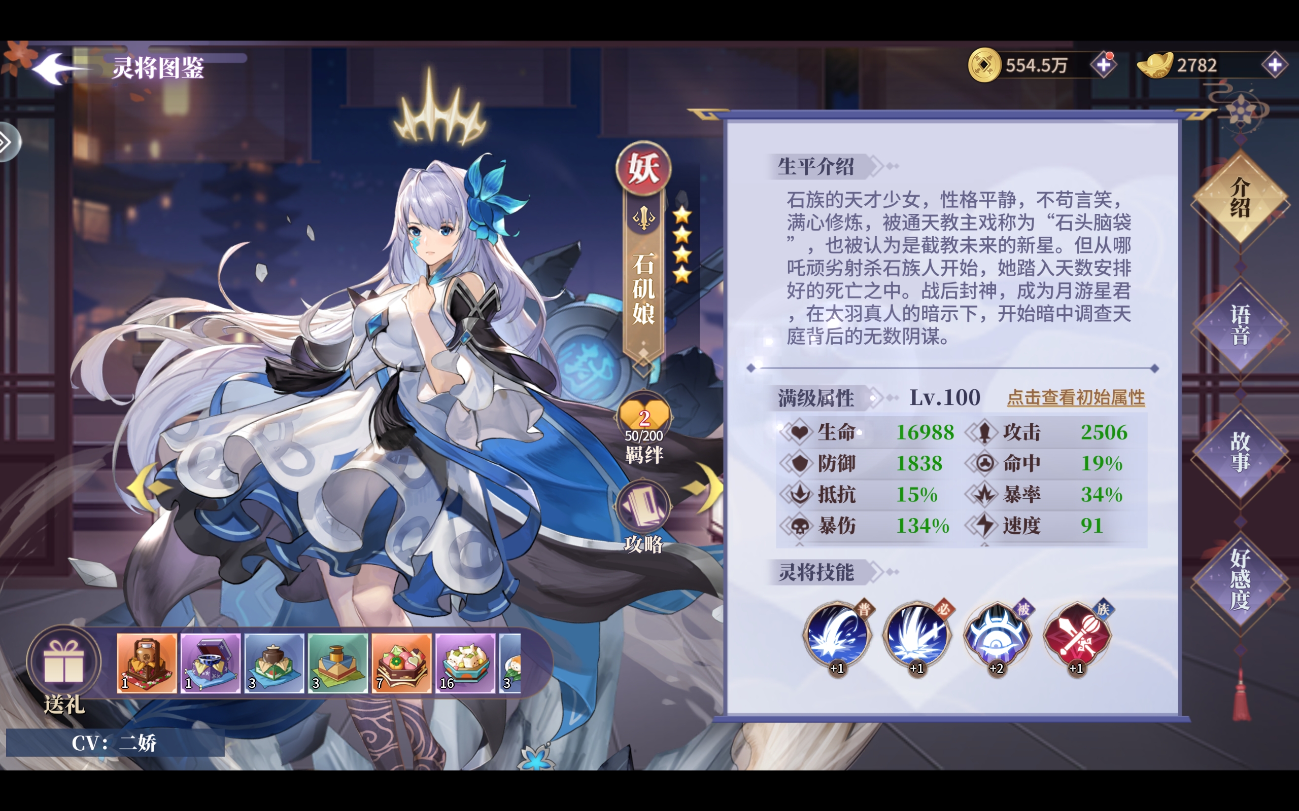 3.石矶娘:妖族主群体C,主要输出依赖先手释放技能,优点在于敌方满员时伤害爆炸,缺点在于后劲不足收割战场能力弱,因此需要阿离补刀。主要的初始获取方式是通过新手任务,而神话卡可以通过一些礼包充值获取。