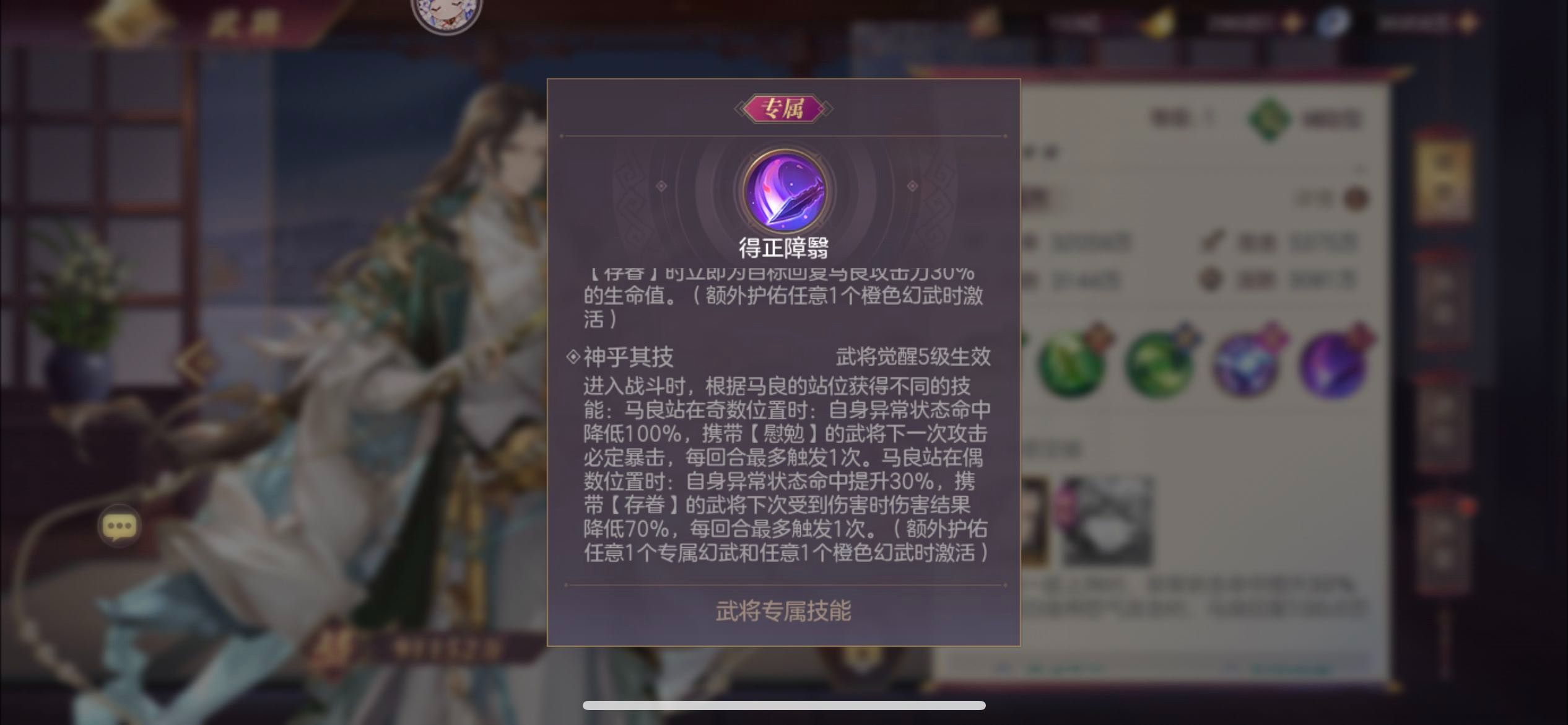 【神乎其技】进入战斗时,根据马良的站位获得不同的技能:马良站在奇数位置时:自身异常状态命中降低100%,携带【慰勉】的武将下一次攻击必定暴击,每回合最多触发1次。马良站在偶数位置时:自身异常状态命中提升30%,携带【存眷】的武将下次受到暴击伤害时伤害结果降低70%,每回合最多触发1次。