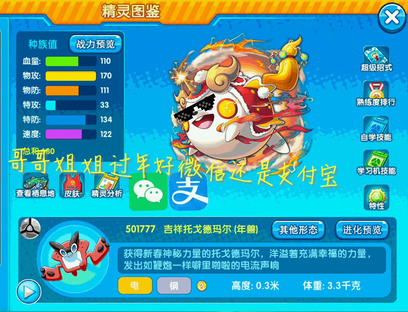 总结:托戈德玛尔,同样是年兽形态却被地鼠甩几条街。地鼠作为高攻高速+狮蚁收割实用性更大,但是像那种残血+联防起来,托戈德玛尔的抗性完爆地鼠几条街,用的好的话,可以为队友祈求回血+电磁波干扰,还能开墙。特性被对面近身攻击打时损失1/8血量。针刺防御防住对手攻击的同时,削减对面1/8血量。你甚至可以带上反射涂层,凹凹头盔,铁刺外衣等进行更大的消耗,只要对面打你就会自己倒霉,你只需要不断的祈求+针刺防御就能把对面恶心的一批。不过局限性比较大。有时候开墙+电磁波后能为输出强化队友创造更好的强化条件,进而输出/推队也是有可能的。如果把它放进钉子户的话,对面有可能会疯掉。最后说一句,托戈德玛尔(年兽)是8折的。看上可以带回家。具体那种玩法,玩家可以自我选择,根据自身队伍需求合理搭配技能和携带物。
