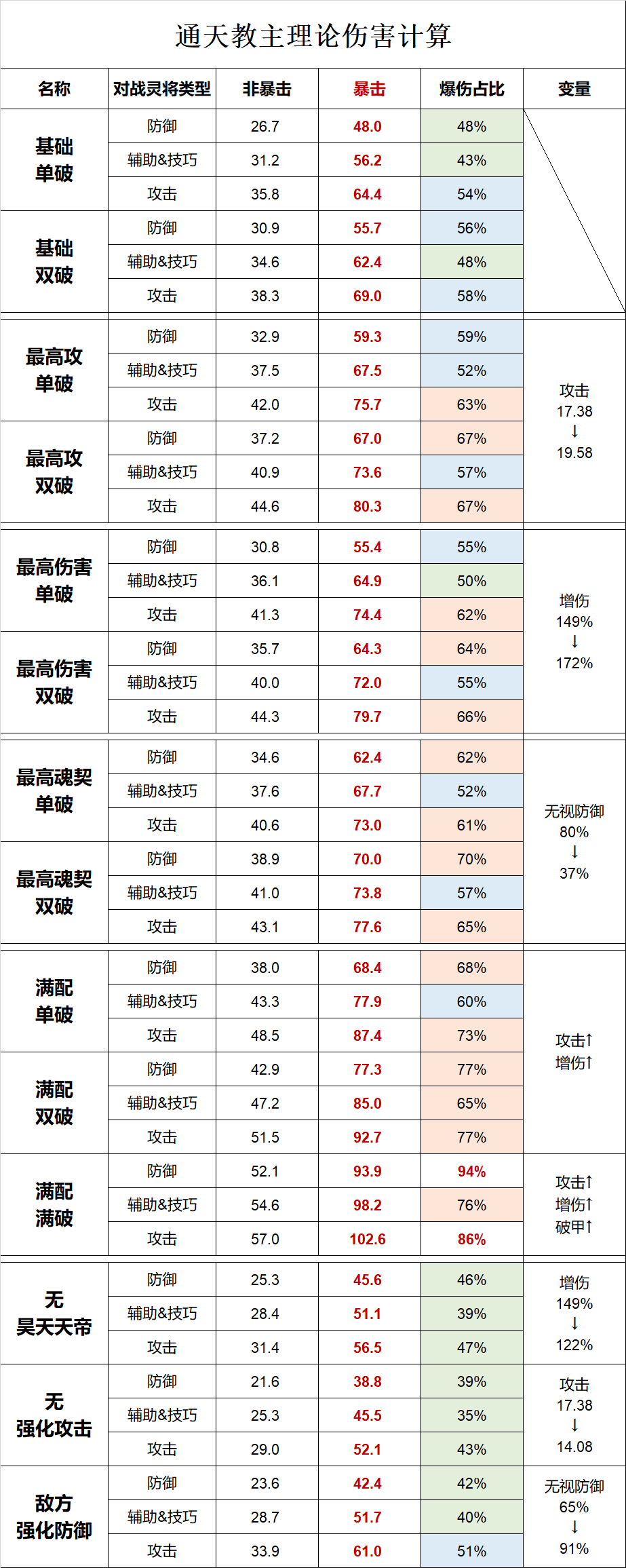 通天教主单破非暴击伤害=(17.38-10/8/6*80%)*166%*149%*115%(易伤)=26.7/31.1/35.7(防/辅&技/攻);暴击伤害分别为48.0/56.1/64.3