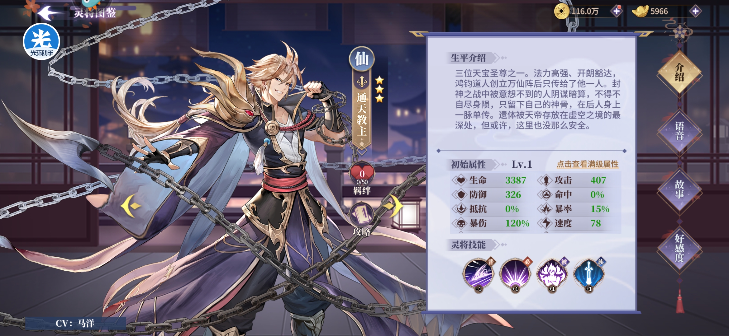 通天教主属于攻击型灵将中攻击成长较高的角色,下列计算中将其攻击定为11;常规阵容对局各灵将以平均值为主阵容搭配:通天教主+昊天天帝+青龙+云霄/嫦娥+太上老君/碧霄/太羽真人